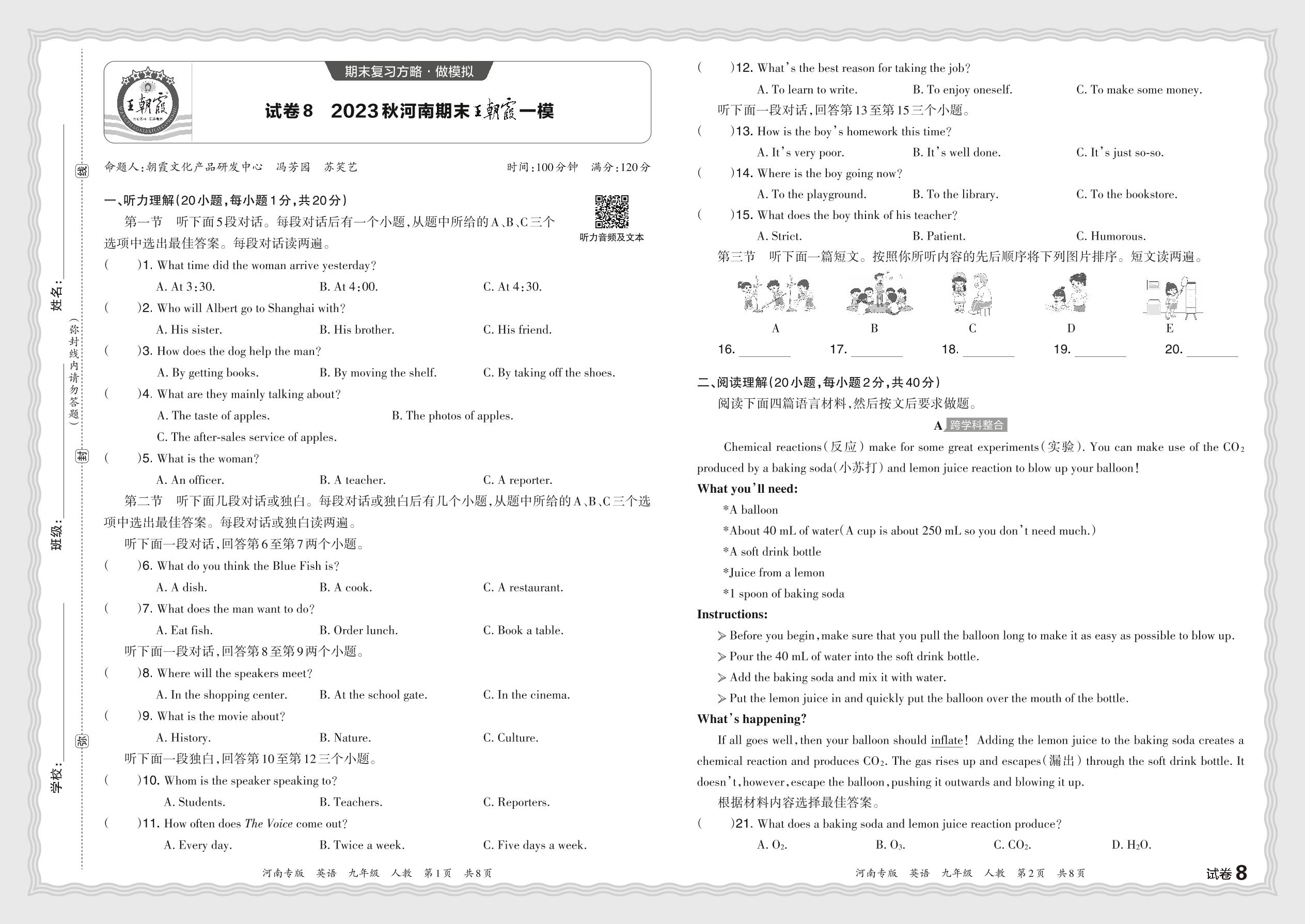 2023秋上册九年级英语人教版 河南期末王朝霞一模