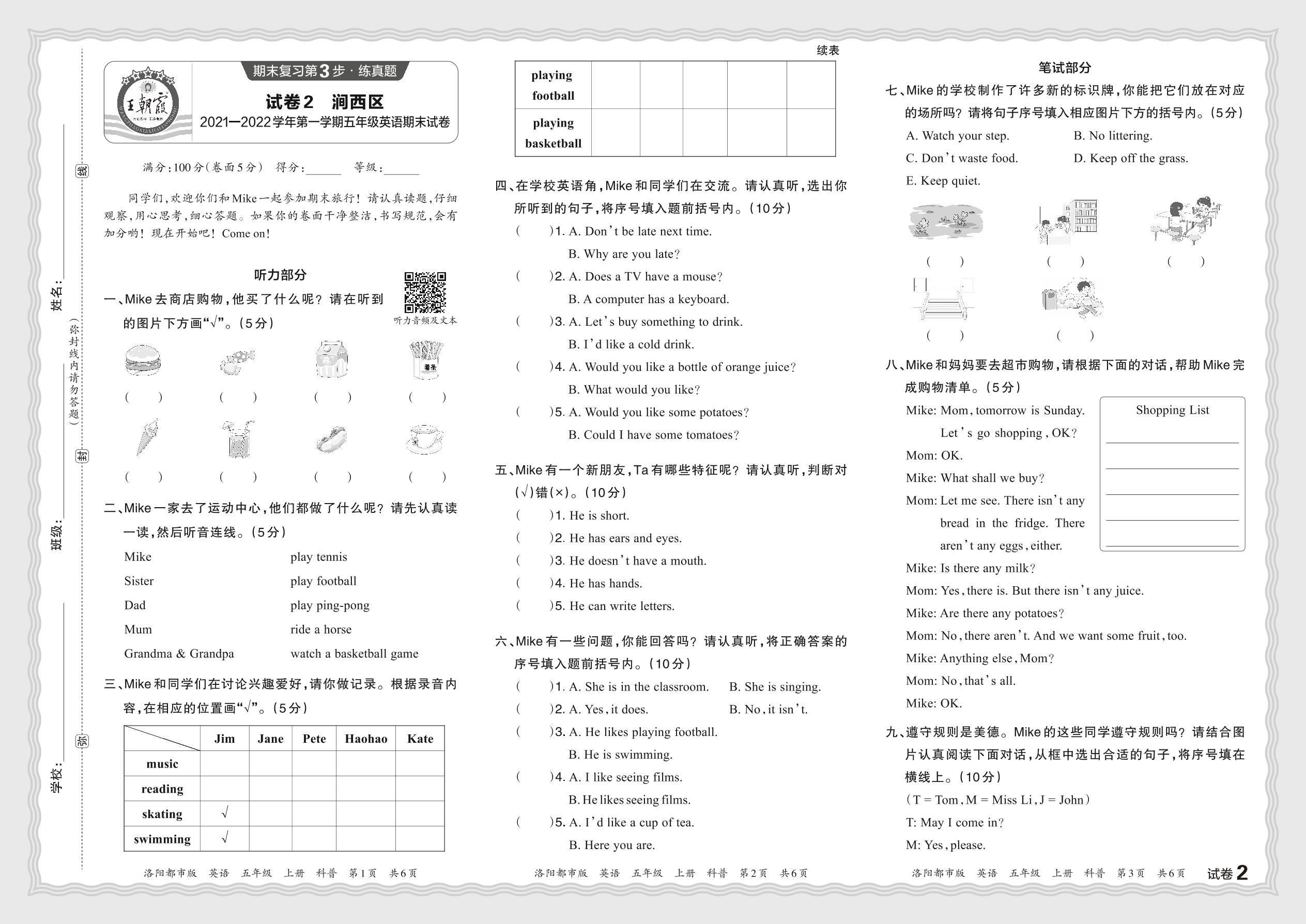 河南省洛阳市涧西区2021—2022学年第一学期五年级英语期末试卷【2】