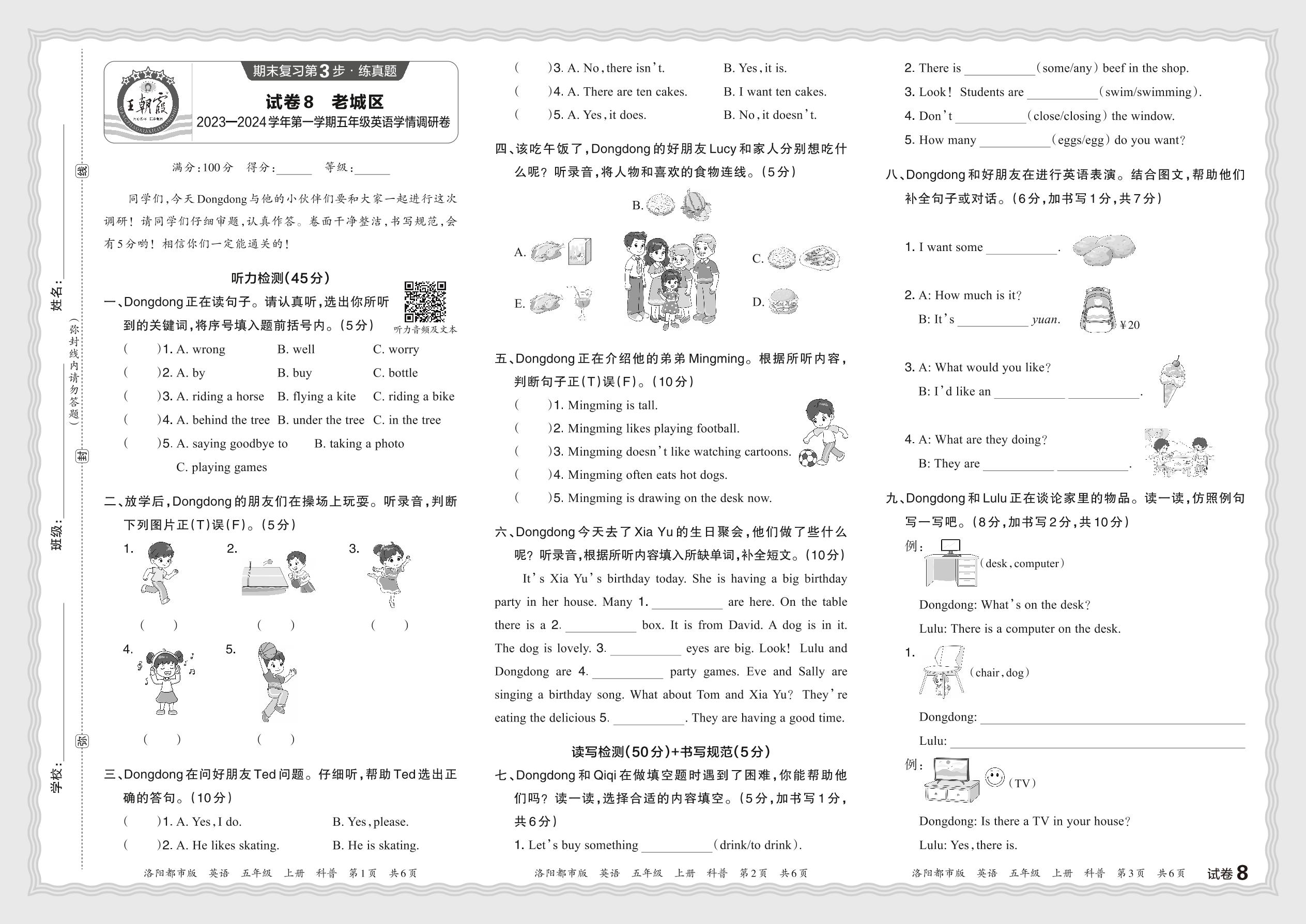 河南省洛阳市老城区2023—2024学年第一学期五年级英语学情调研卷(科普版)【8】