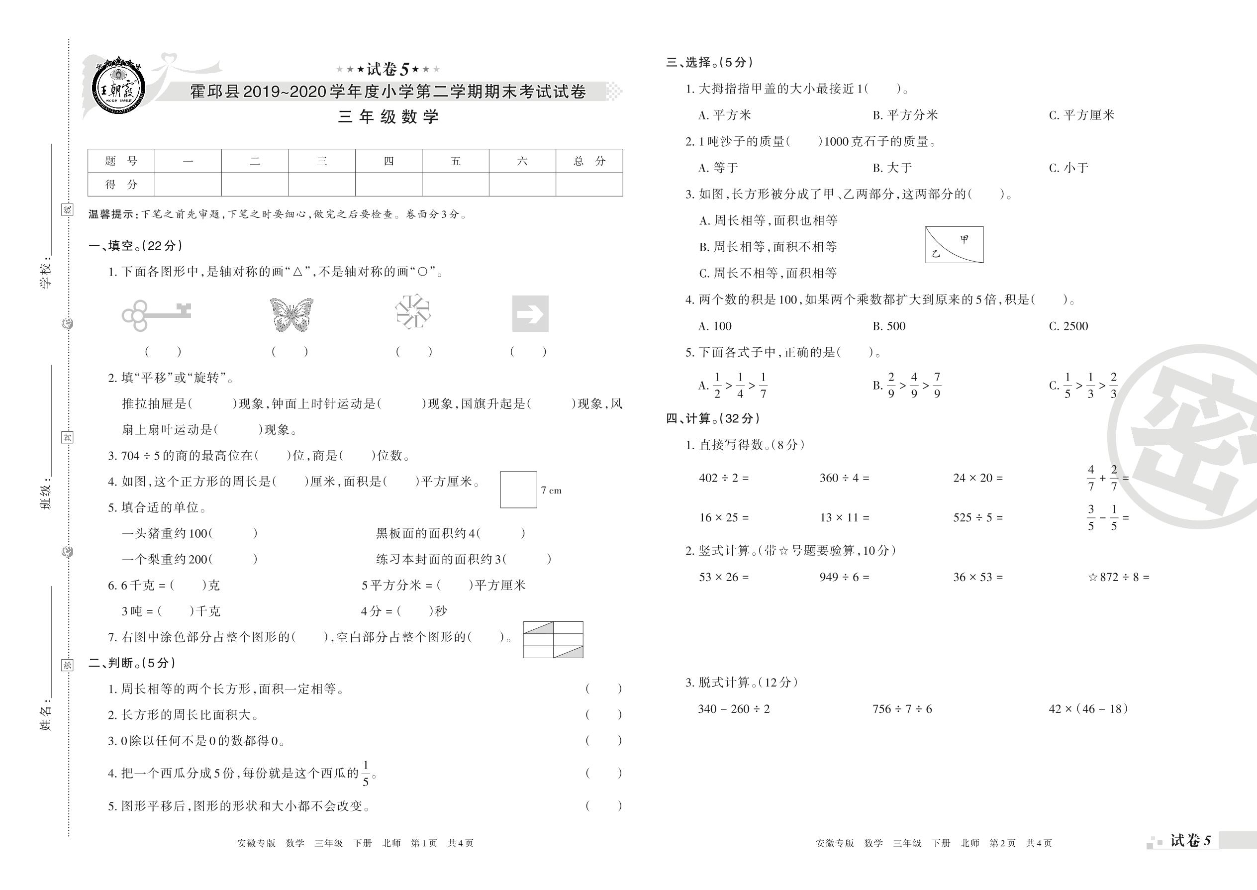 2019-2020学年第二学期六安市霍邱县三年级数学试卷(北师版)【5】