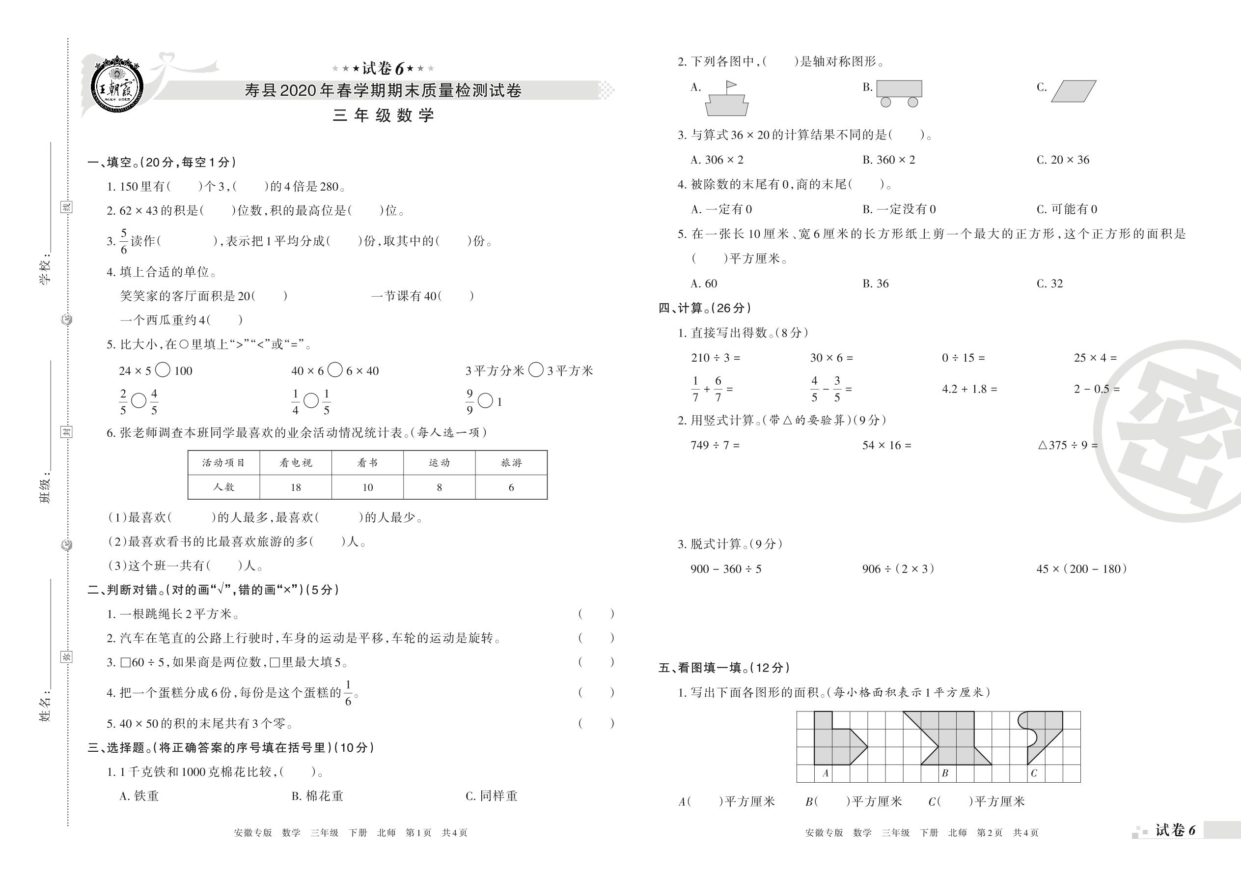 2019-2020学年第二学期淮南市寿县三年级数学试卷(北师版)【6】