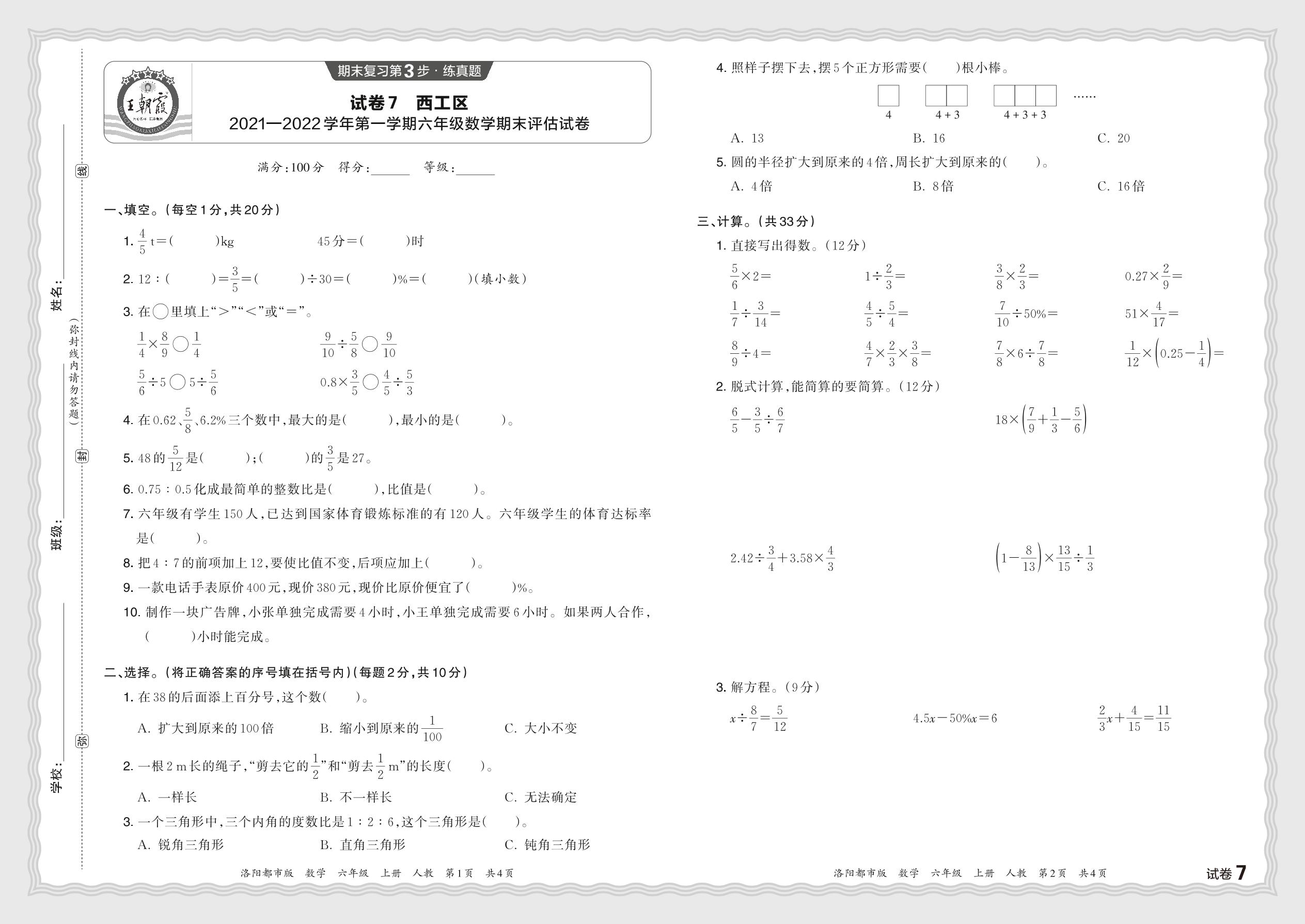 河南省洛阳市西工区2021—2022学年第一学期六年级数学期末质量评估试卷(人教版)【7】