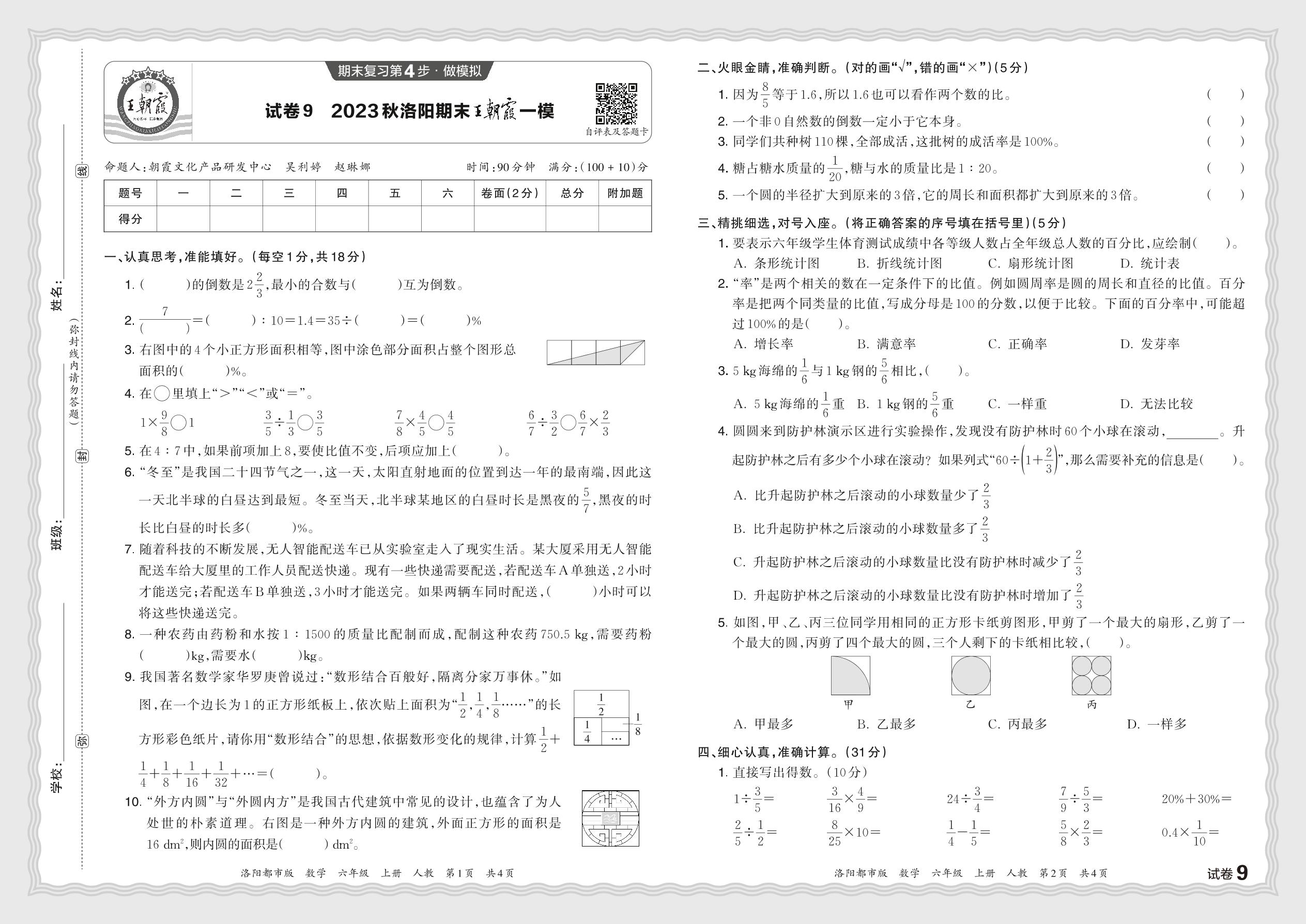 2023秋上册六年级数学人教版 河南洛阳期末王朝霞一模【9】