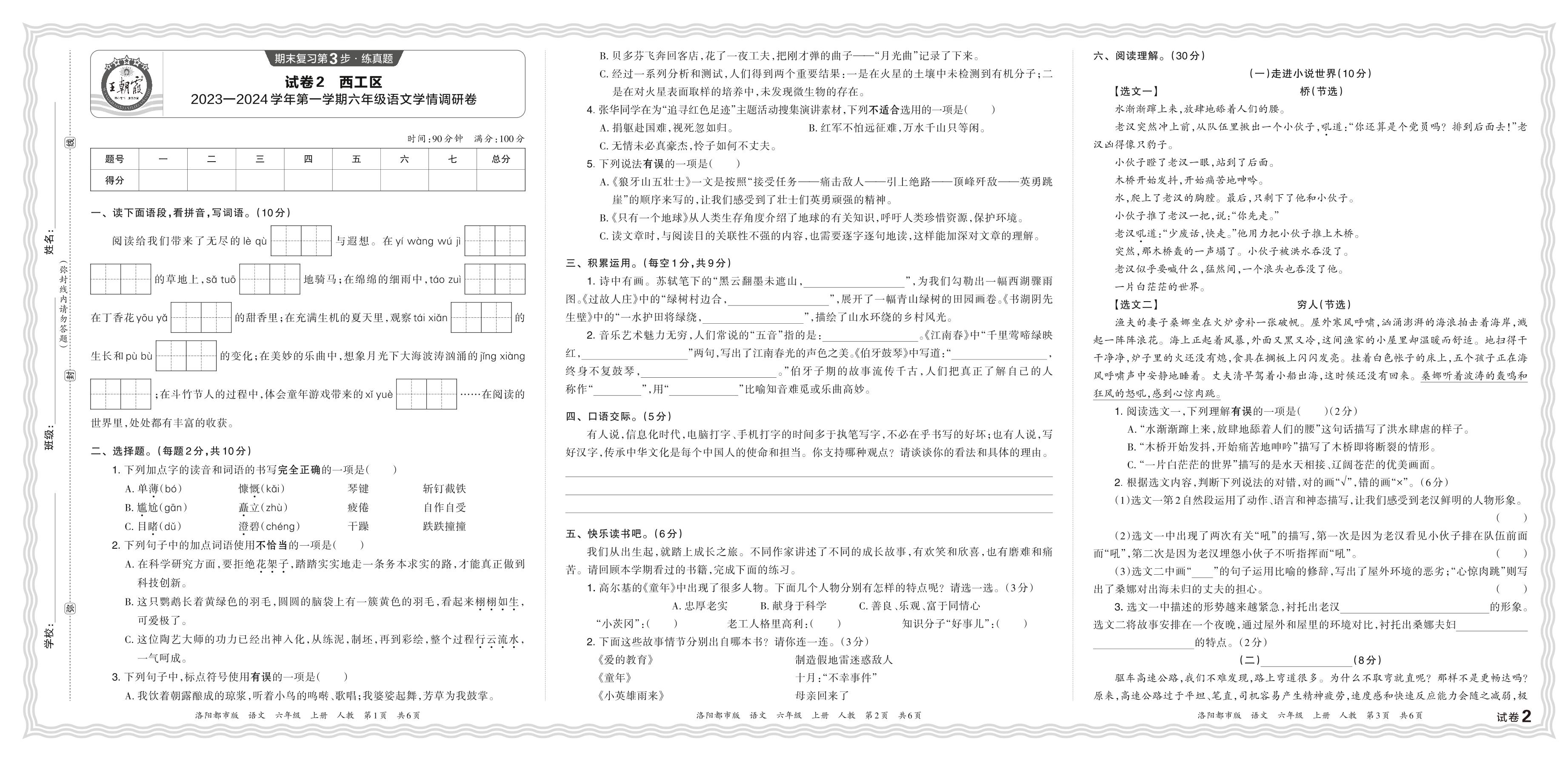 河南省洛阳市西工区2023—2024 学年第一学期六年级语文学情调研卷(人教版)【2】