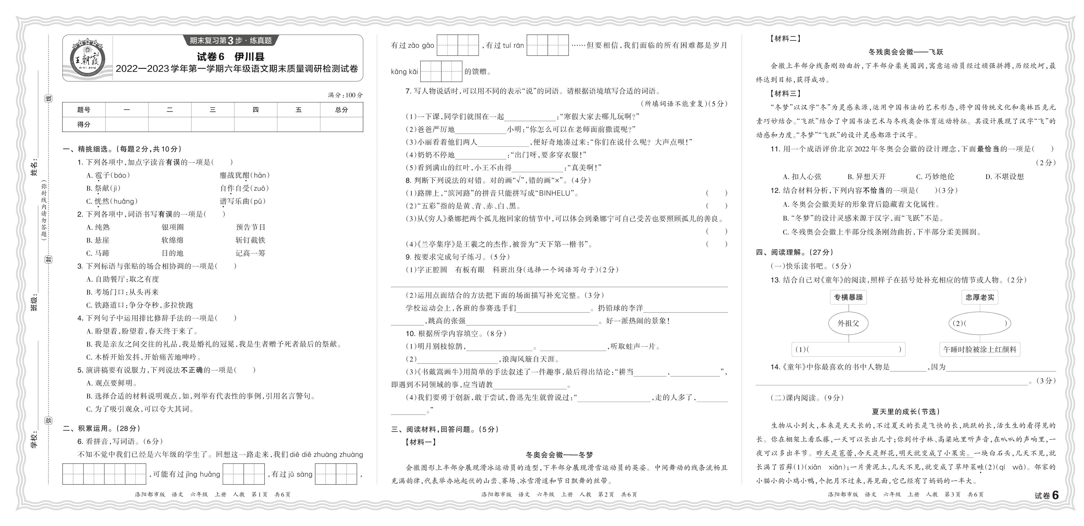 河南省洛阳市伊川县2022—2023学年第一学期六年级语文期末质量调研检测试卷(人教版)【6】