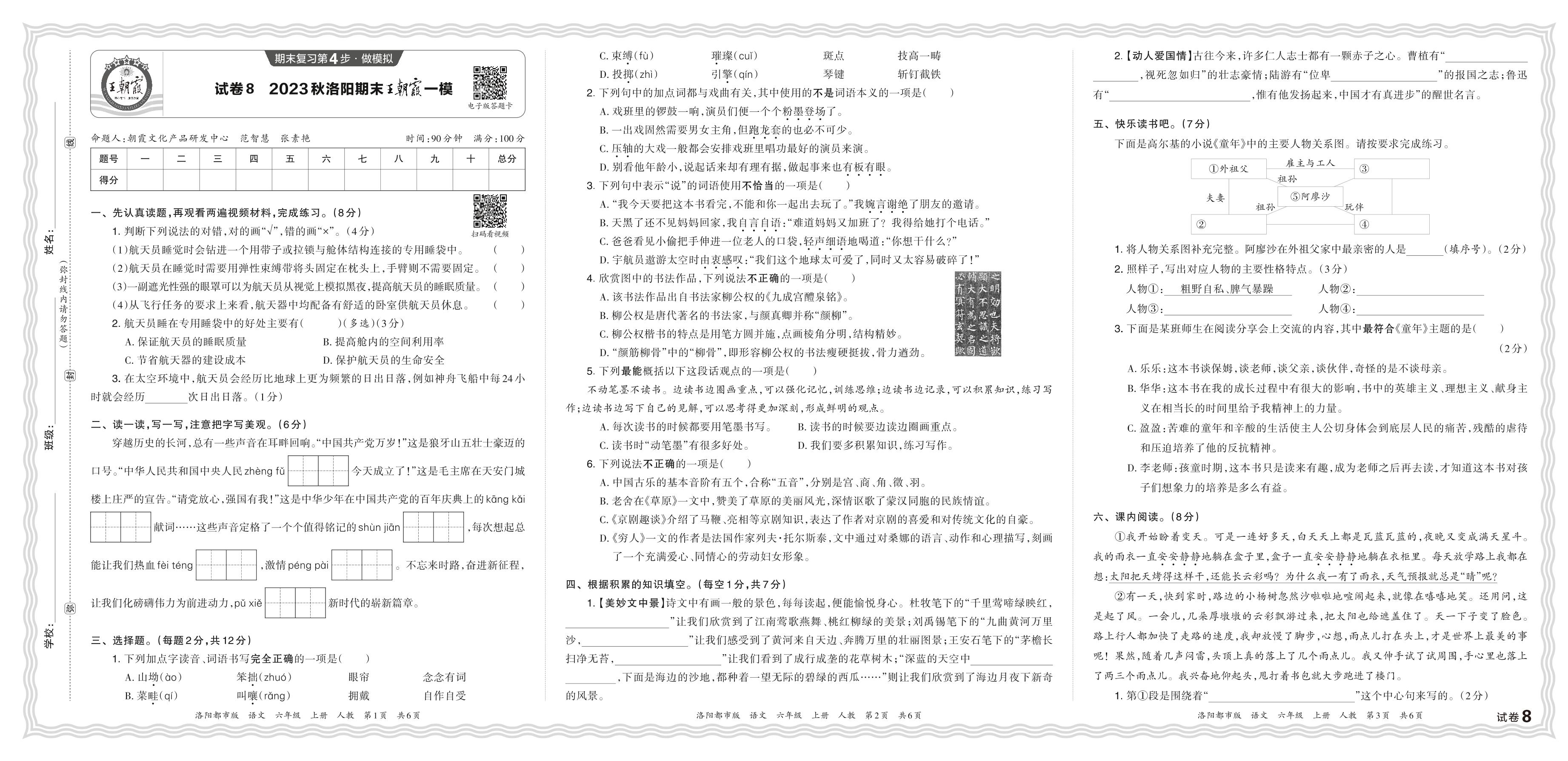 2023秋上册六年级语文人教版 河南洛阳期末王朝霞一模【8】