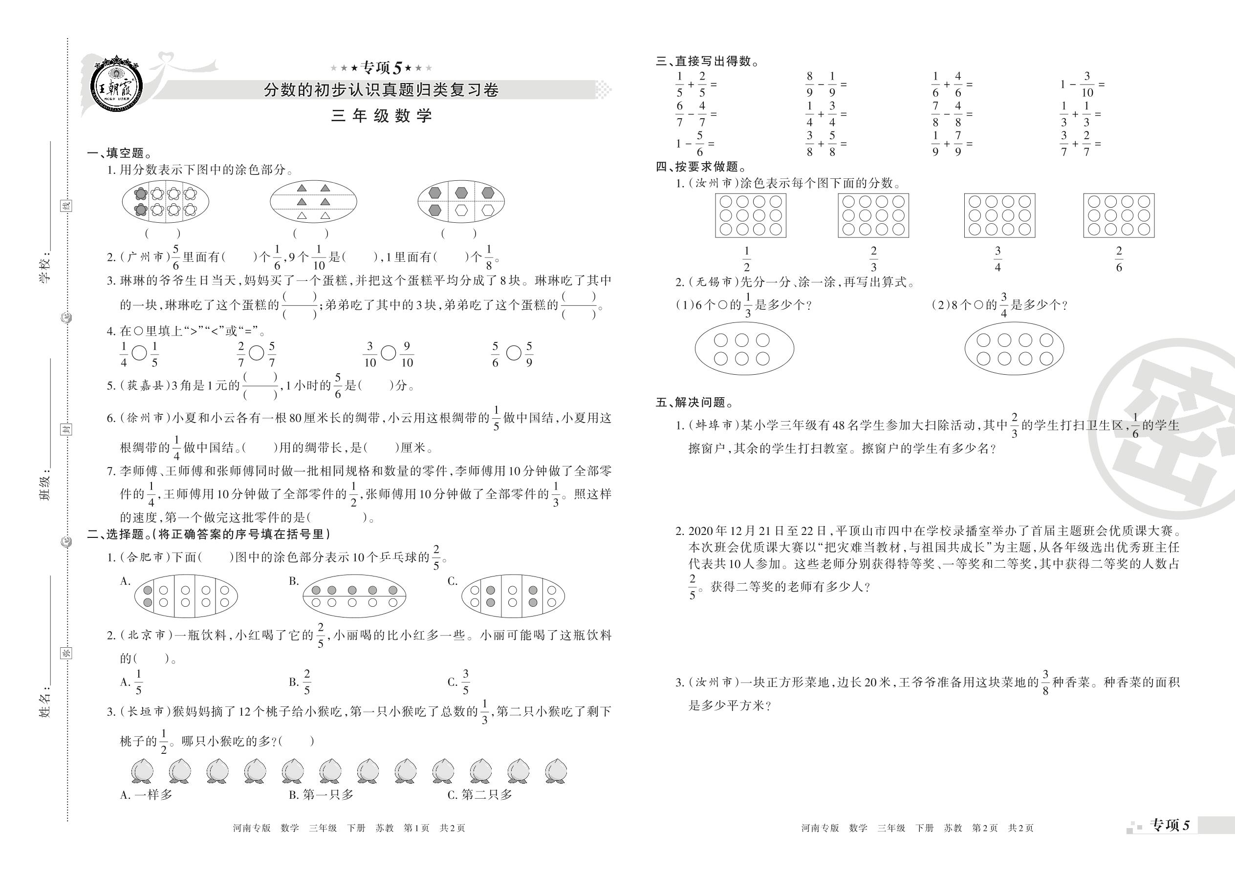 王朝霞期末专项卷——分数的初步认识、小数的初步认识真题归类复习三年级下册数学(苏教版)【0】
