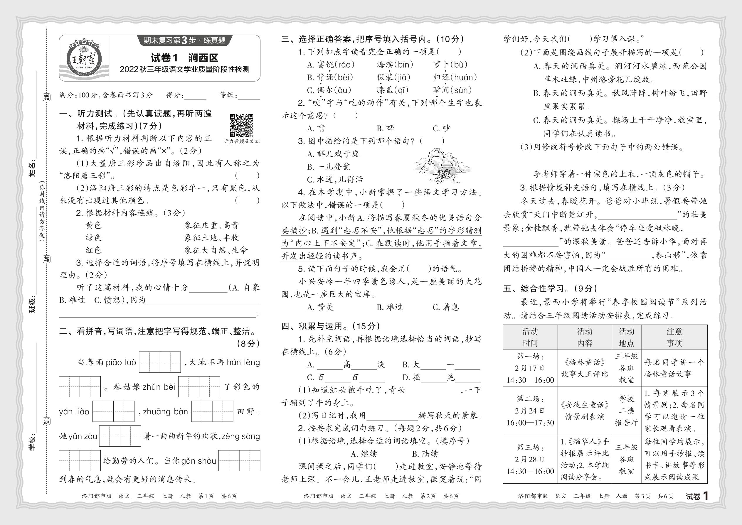 河南省洛阳市涧西区2022—2023学年第一学期三年级语文学业质量阶段性检测(人教版)【1】