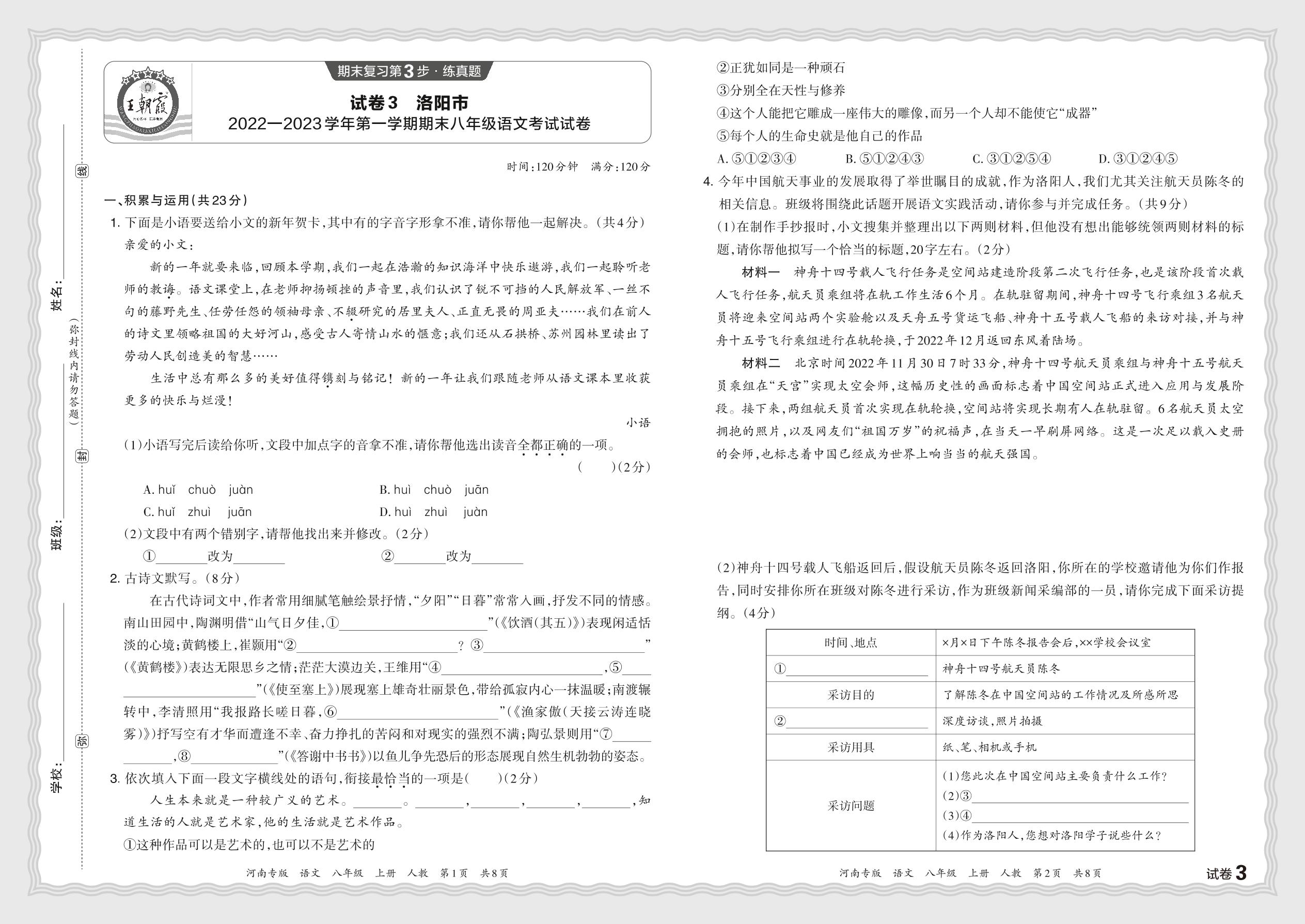 河南省洛阳市2022—2023学年第一学期期末八年级语文考试试卷(人教版)【3】