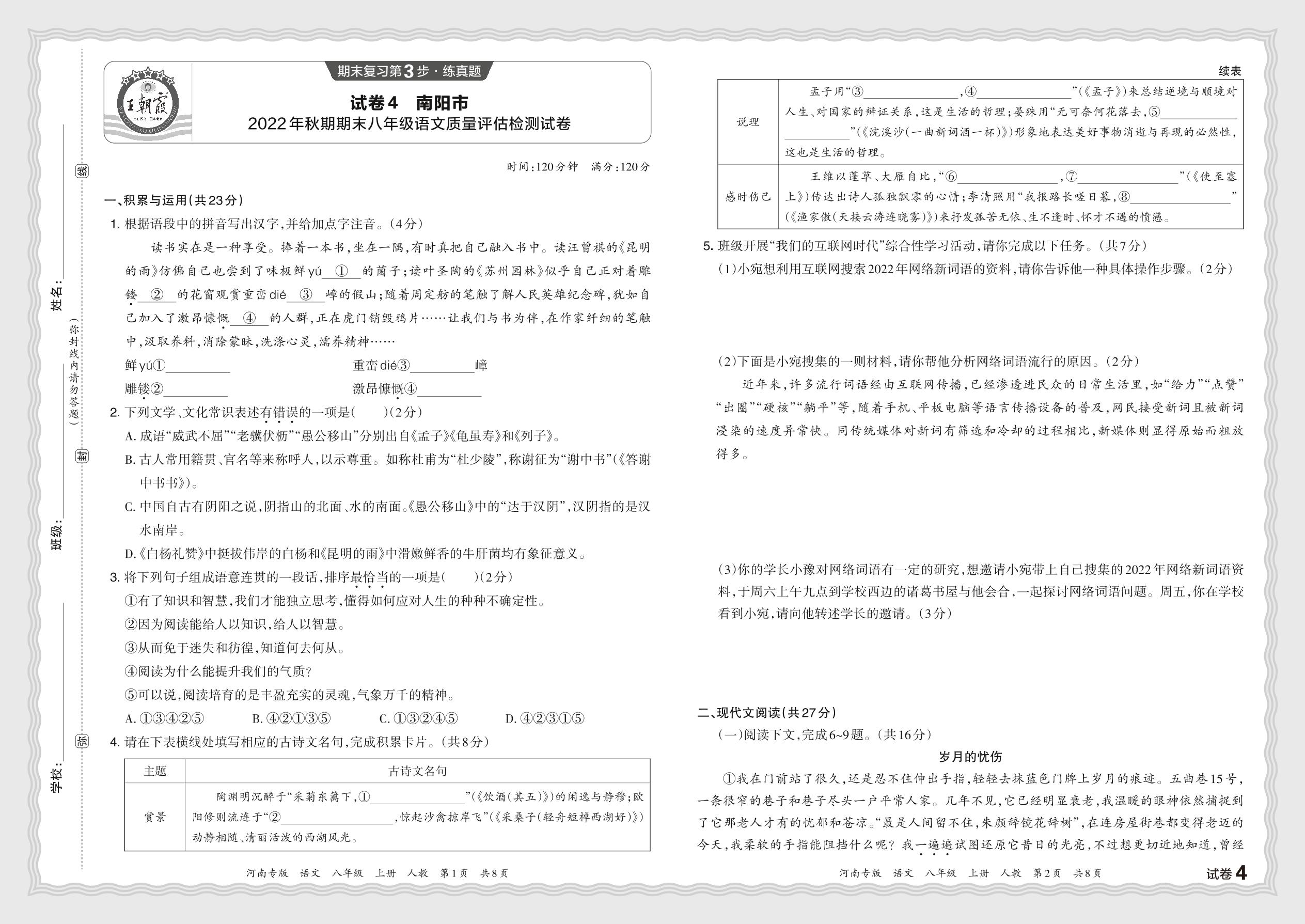 河南省南阳市2022年秋期期未八年级语文质量评估检测试卷(人教版)【4】
