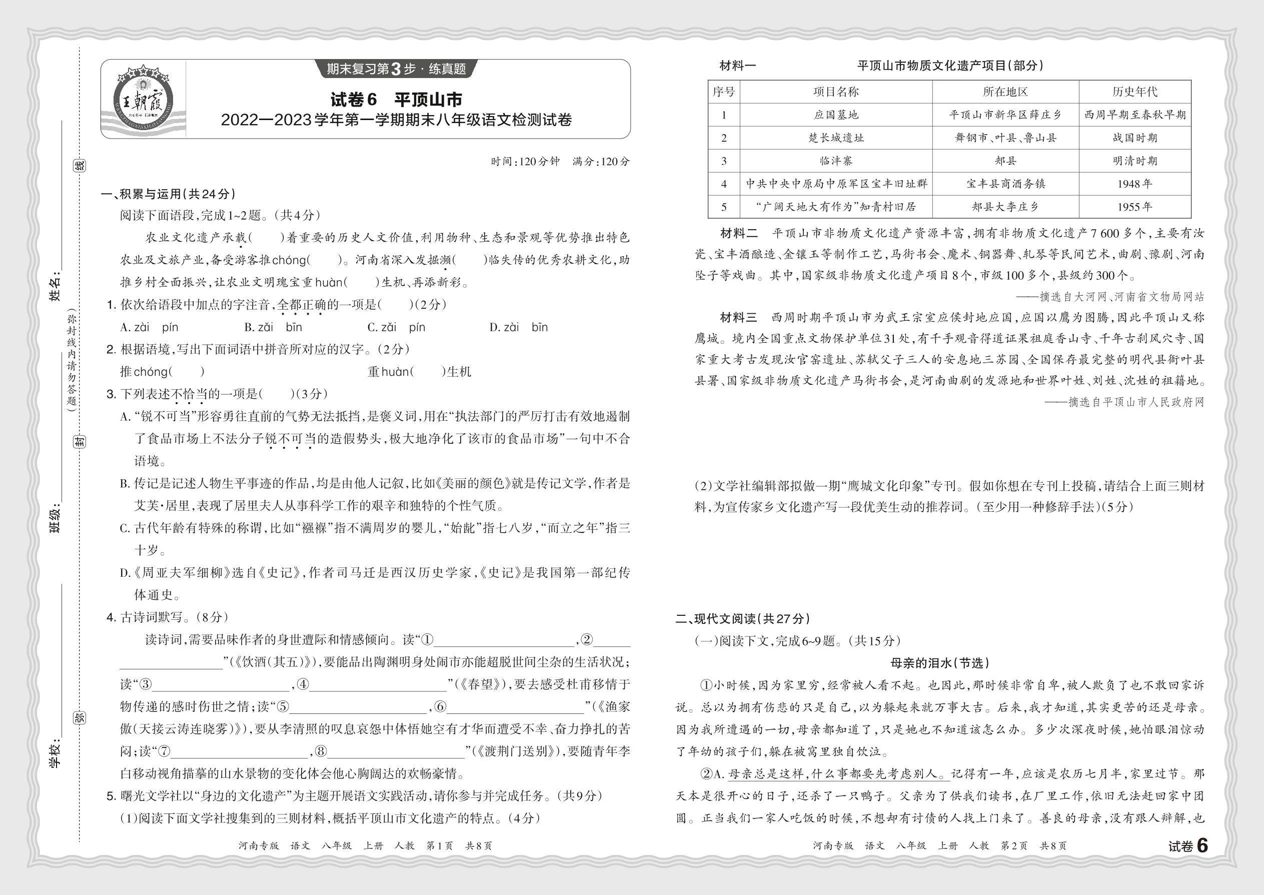 河南省平顶山市2022—2023学年第一学期期末八年级语文检测试卷(人教版)【6】