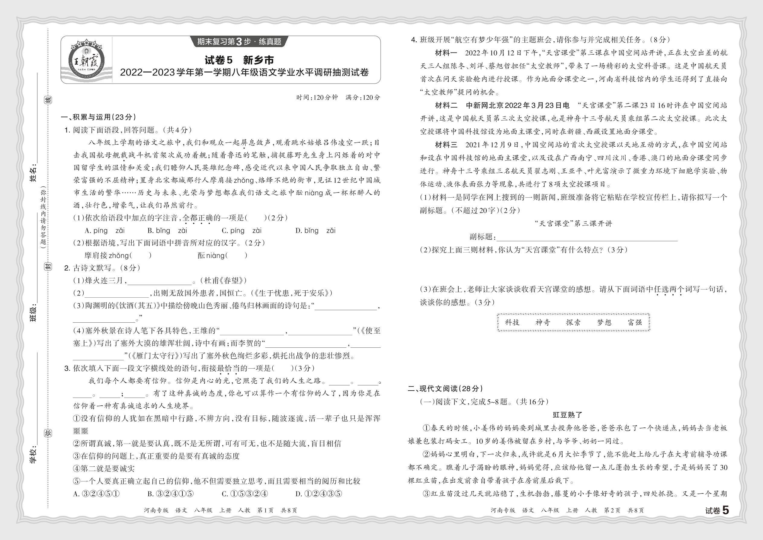 河南省新乡市2022—2023学年第一学期八年级语文学业水平调研抽测试卷(人教版)【5】