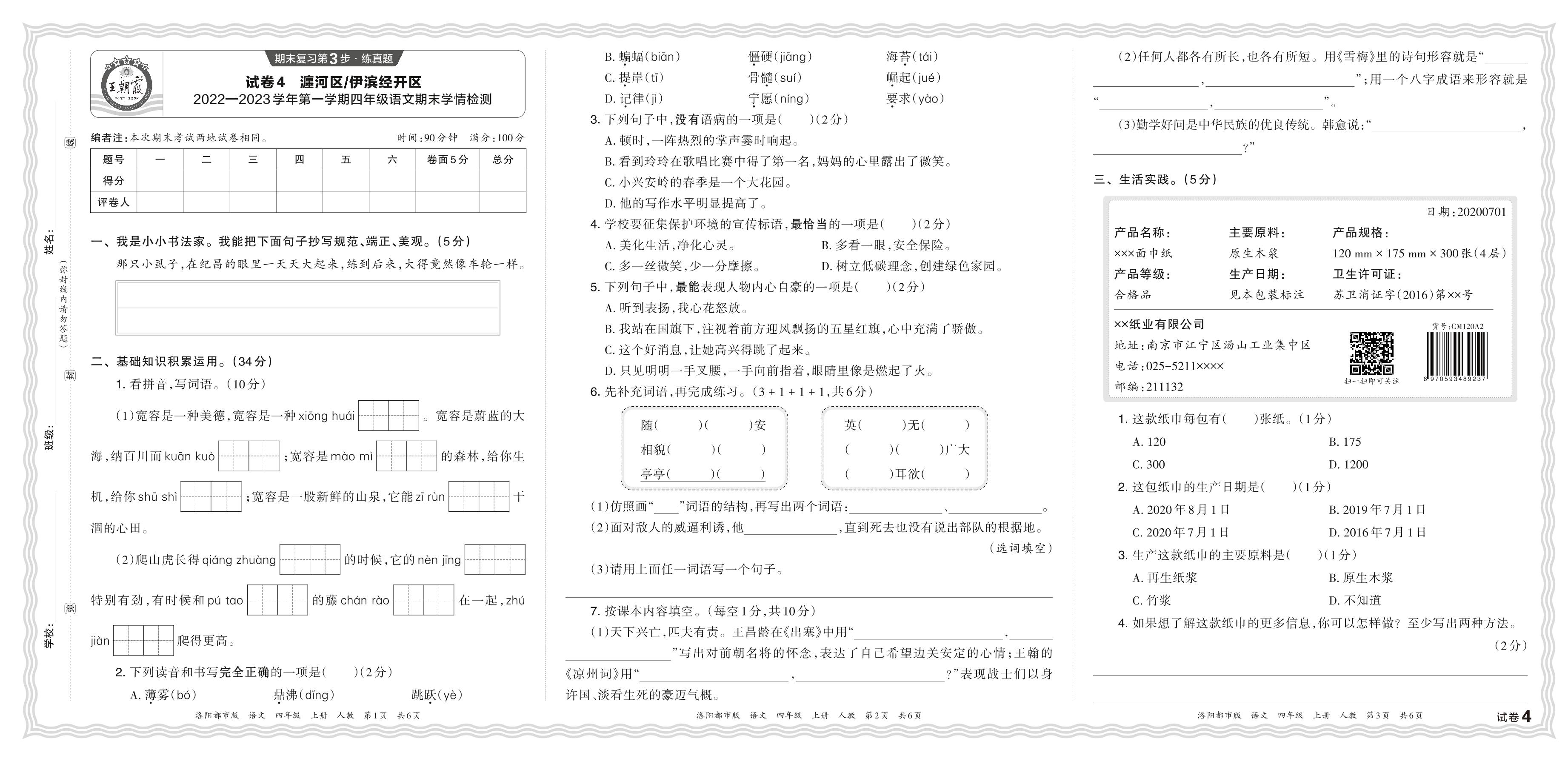 河南省洛阳市瀍河区、伊滨经开区2022—2023学年第一学期四年级语文期末学情检测(人教版)【4】