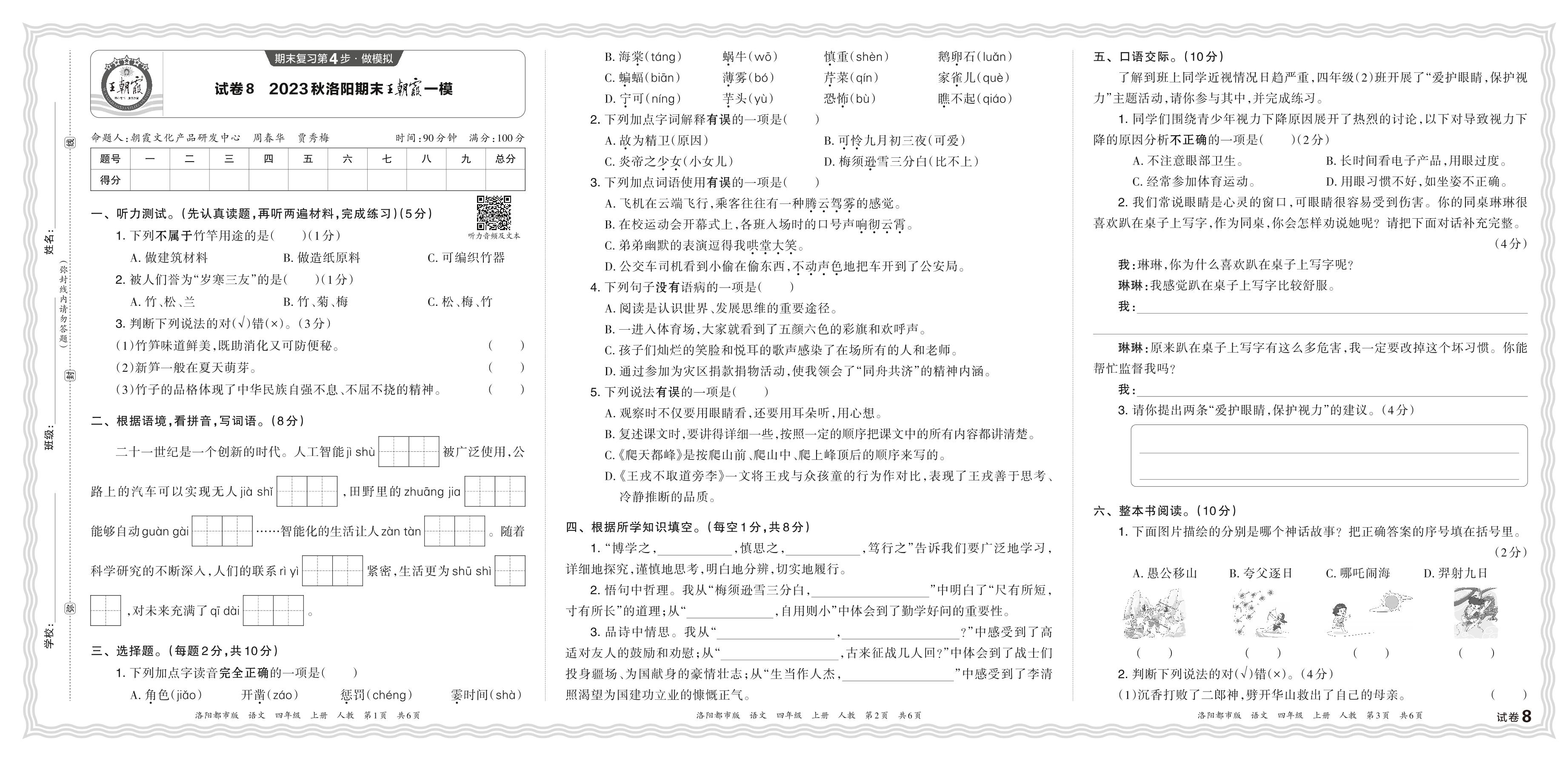 2023秋上册四年级语文人教版 河南洛阳期末王朝霞一模【8】