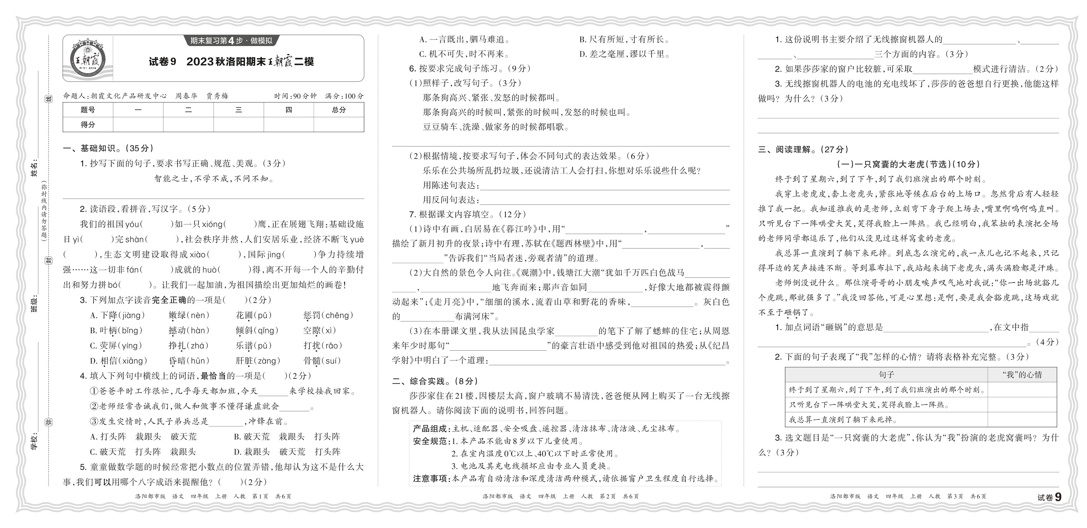 2023秋上册四年级语文人教版 河南洛阳期末王朝霞二模【9】