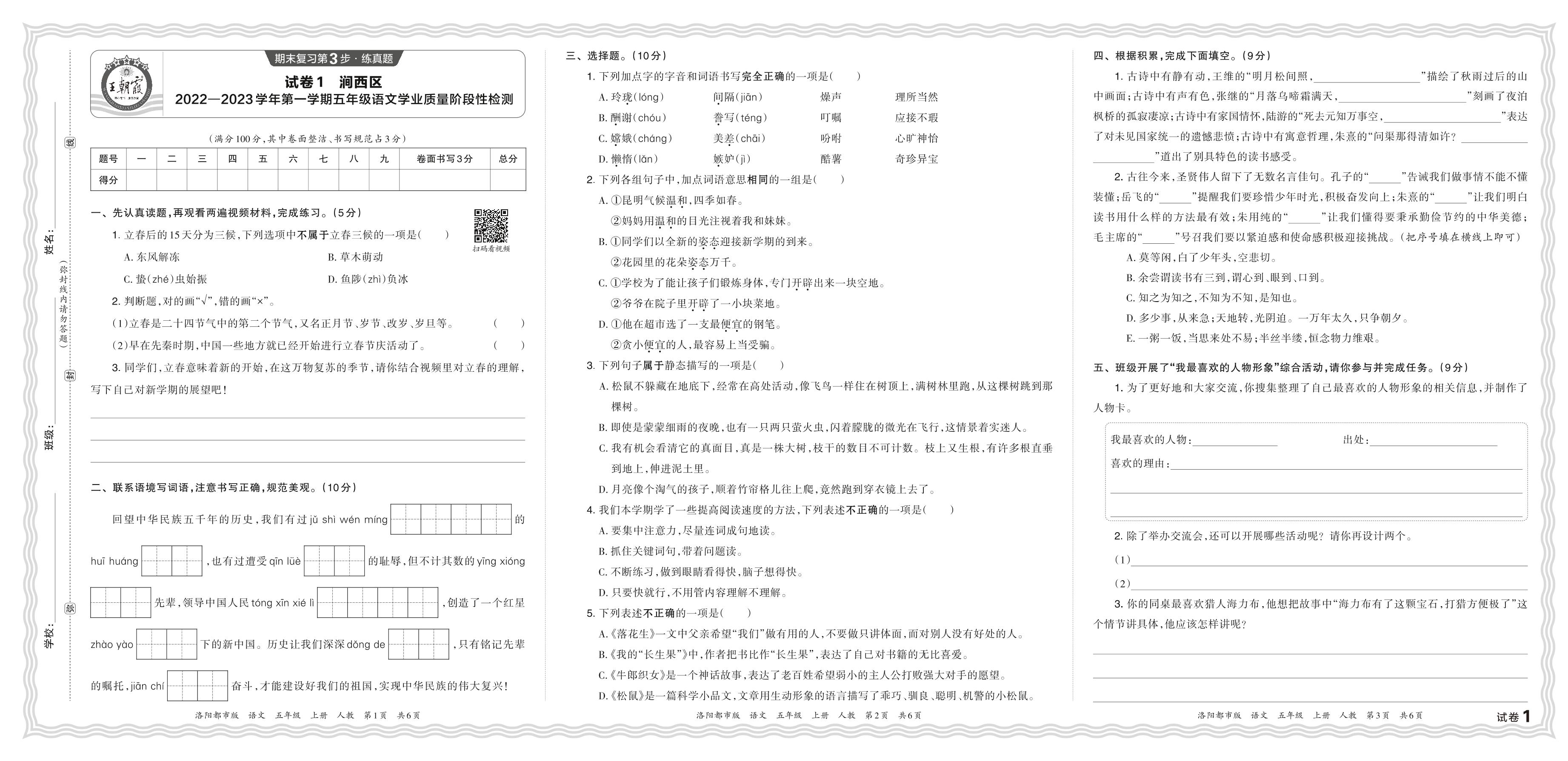 河南省洛阳市涧西区2022—2023学年第一学期五年级语文学业质量阶段性检测(人教版)【1】