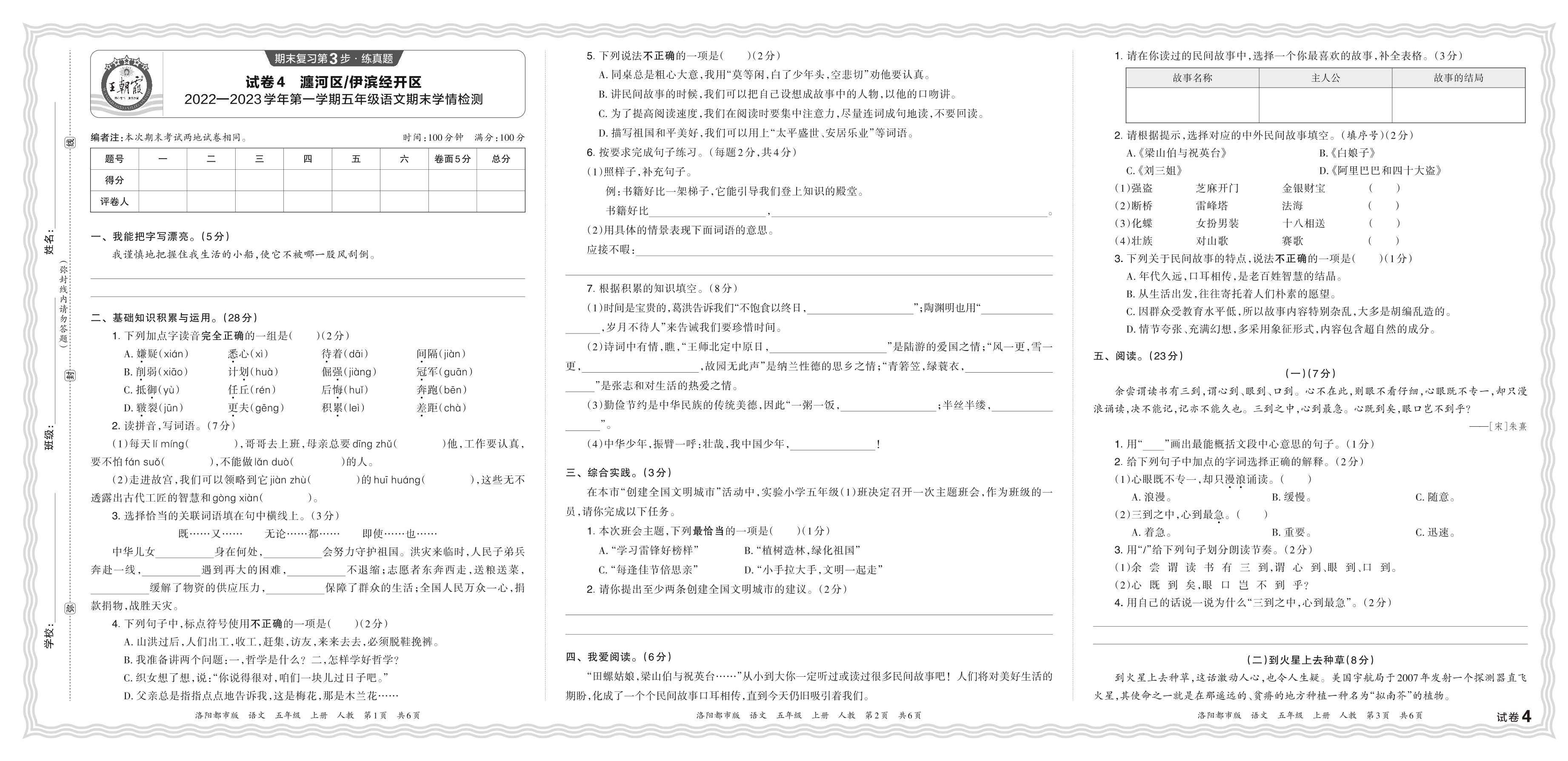河南省洛阳市瀍河区、伊滨经开区2022—2023学年第一学期五年级语文期末学情检测(人教版)【4】