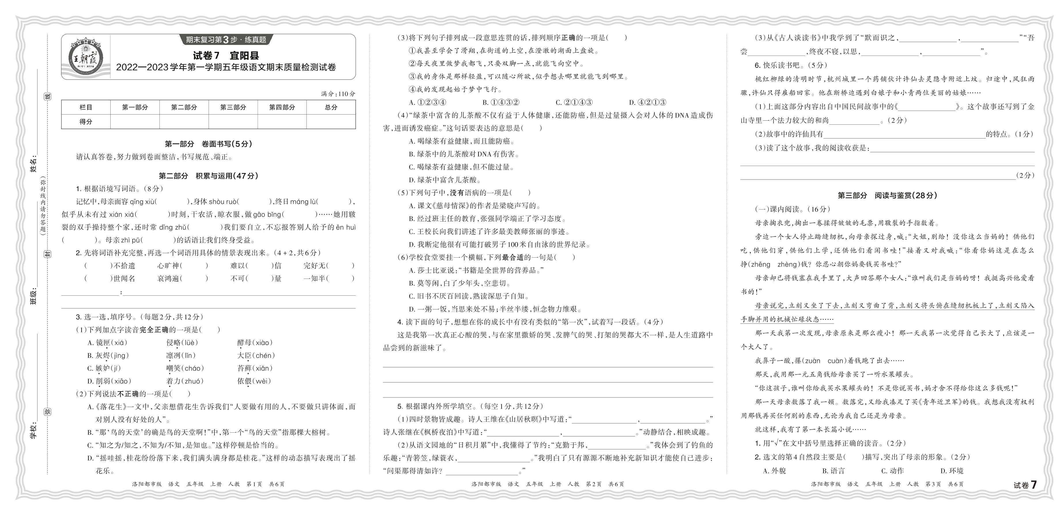 河南省洛阳市宜阳县2022—2023学年第一学期五年级语文期末质量检测试卷(人教版)【7】