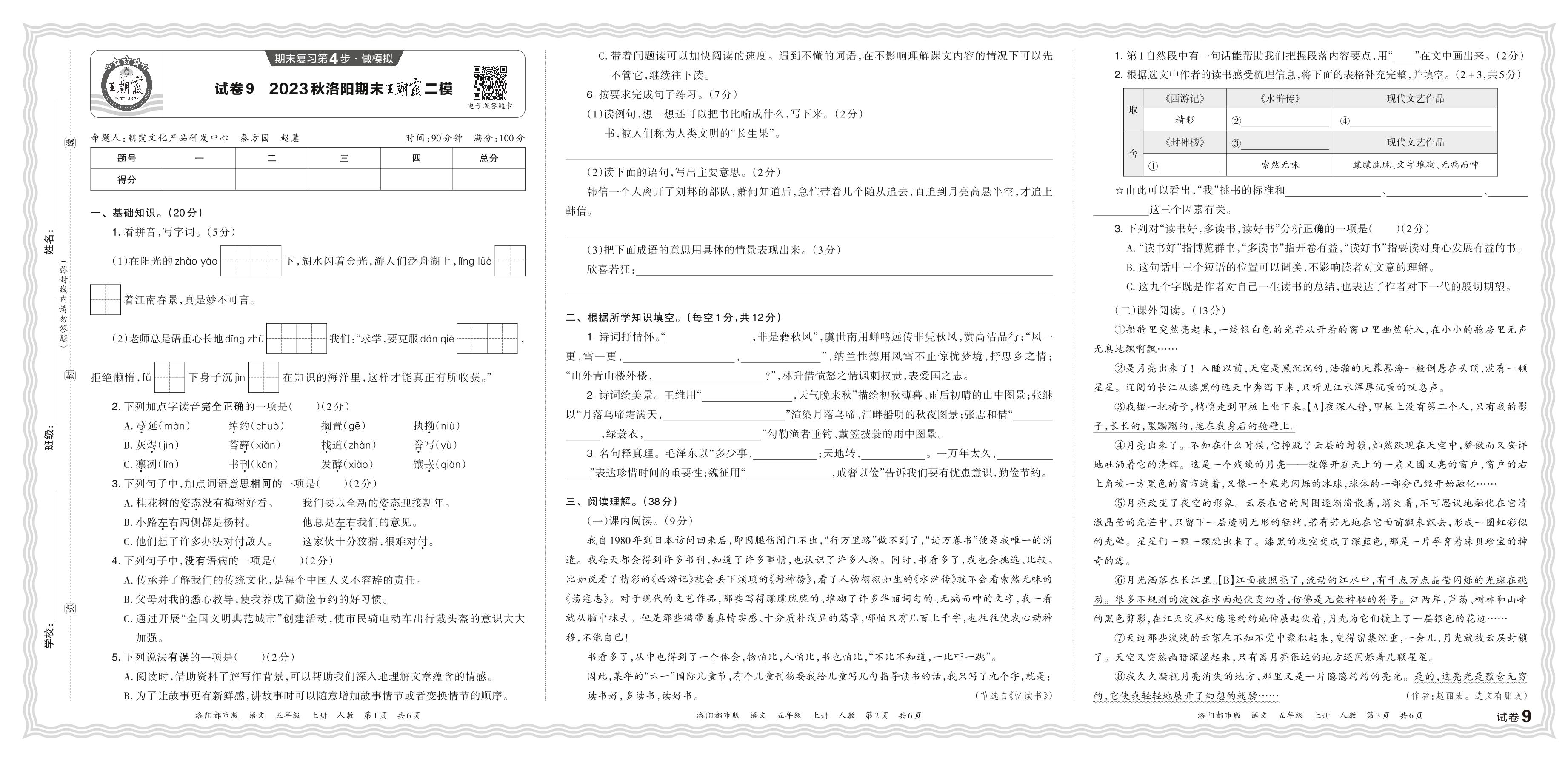 2023秋上册五年级语文人教版 河南洛阳期末王朝霞二模【9】