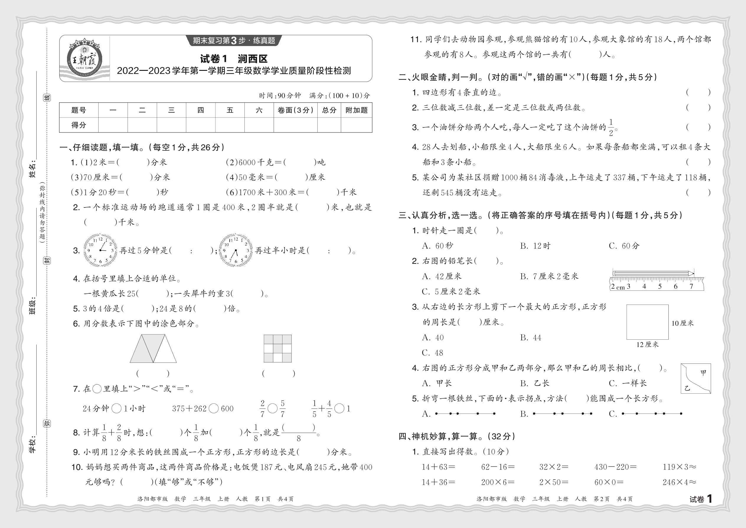 河南省洛阳市涧西区2022—2023学年第一学期三年级数学学业质量阶段性检测(人教版)【1】
