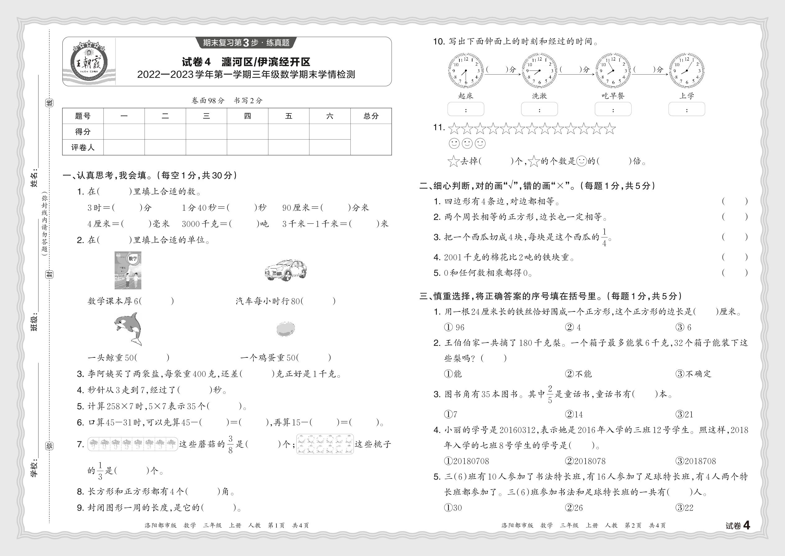 河南省洛阳市瀍河区、伊滨经开区2022—2023学年第一学期三年级数学期末学情检测(人教版)【4】