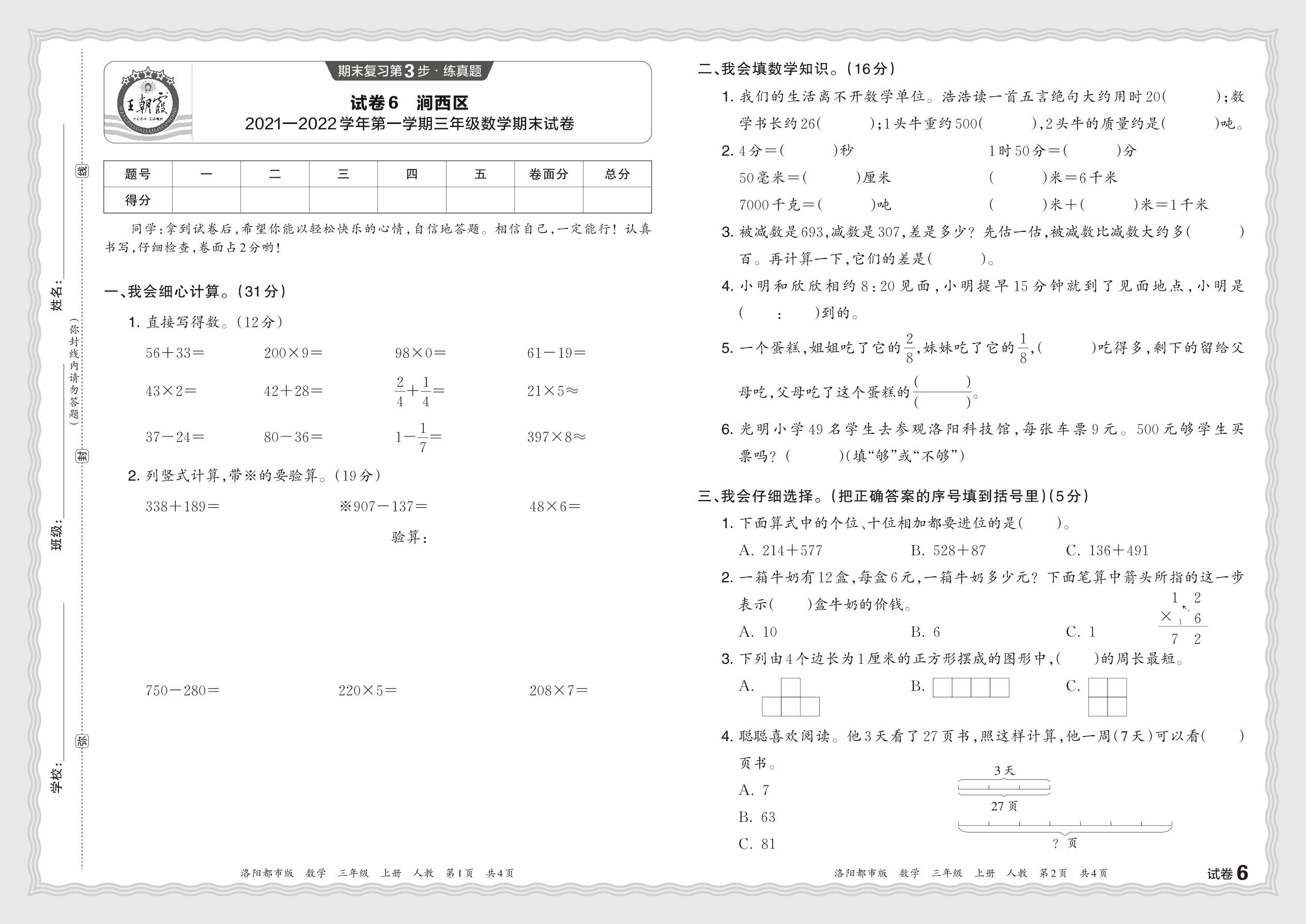 河南省洛阳市涧西区2021—2022学年第一学期三年级数学期末试卷(人教版)【6】