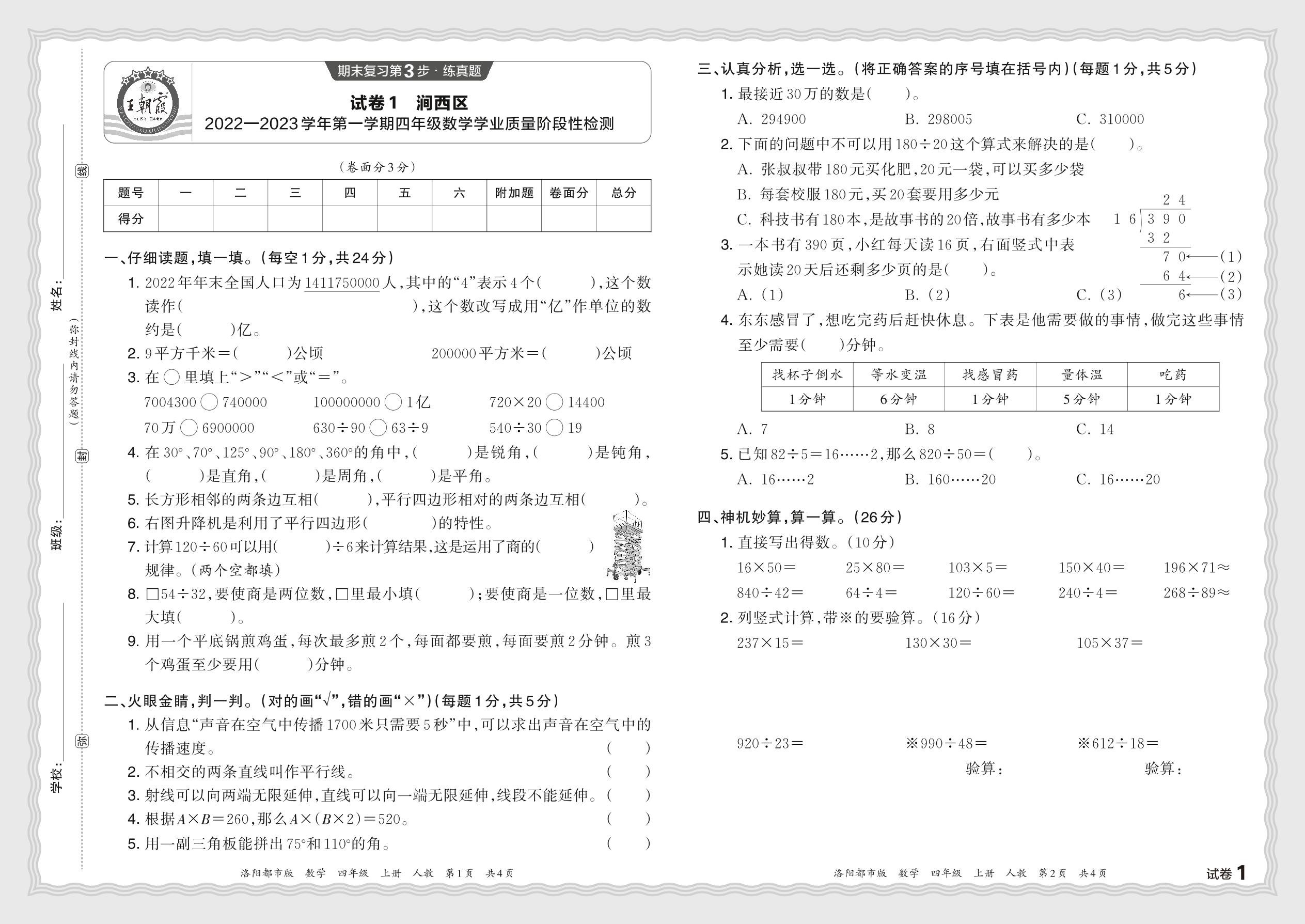 河南省洛阳市涧西区2022—2023学年第一学期四年级数学学业质量阶段性检测(人教版)【1】