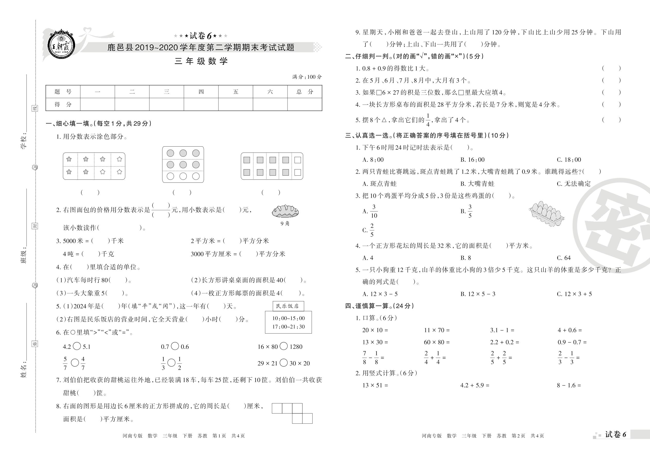 2019-2020学年第二学期周口市鹿邑县三年级数学试卷(苏教版)【6】