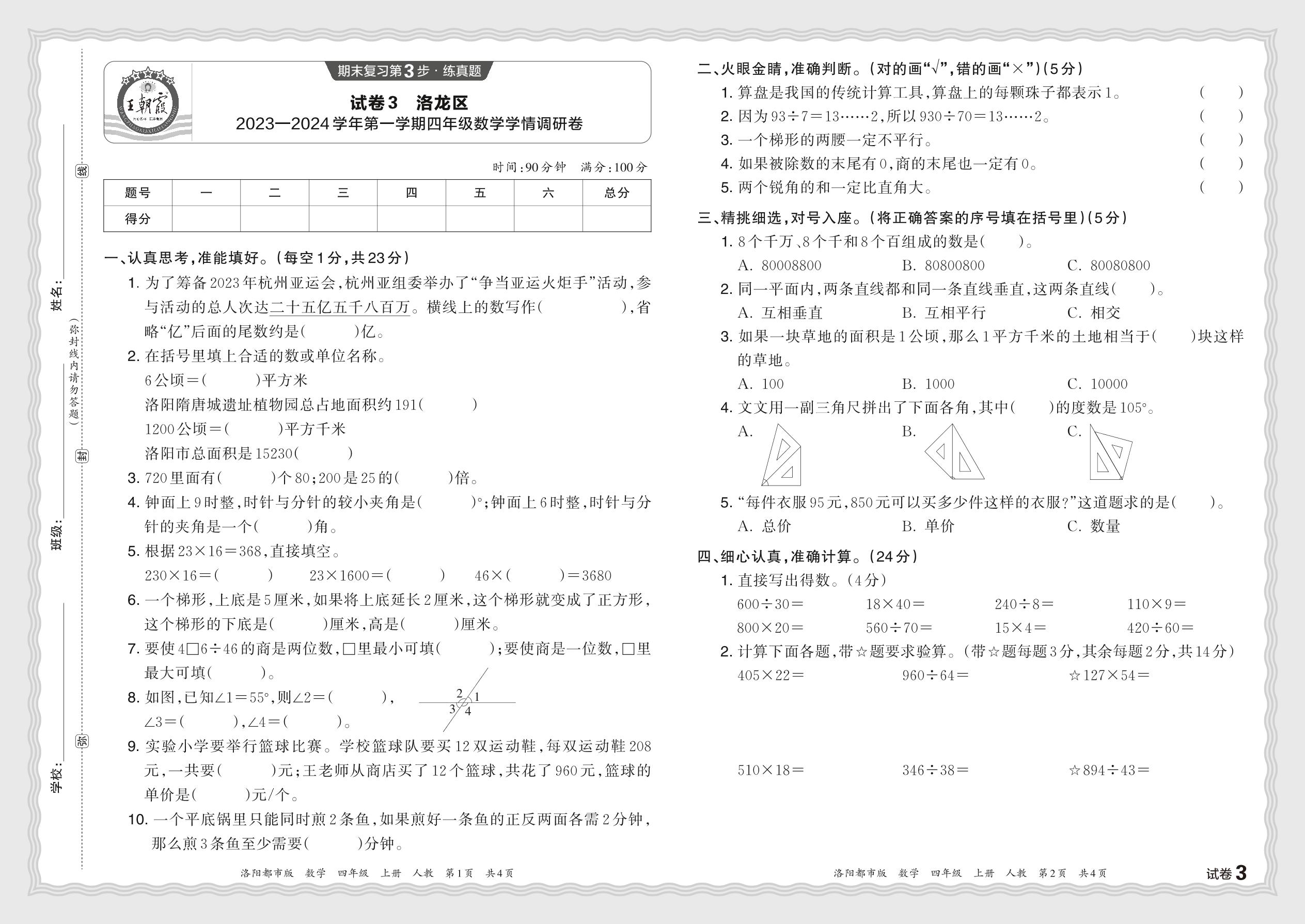 河南省洛阳市洛龙区2023—2024学年第一学期四年级数学学情调研卷【3】