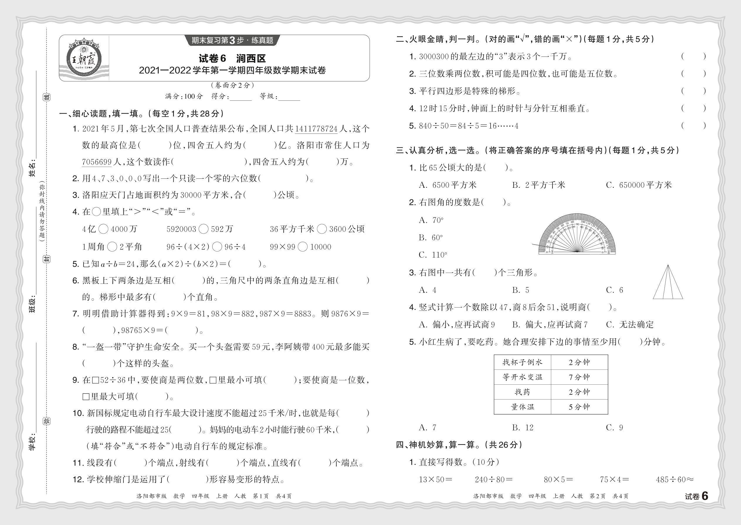 河南省洛阳市涧西区2021—2022学年第一学期四年级数学期末试卷(人教版)【6】