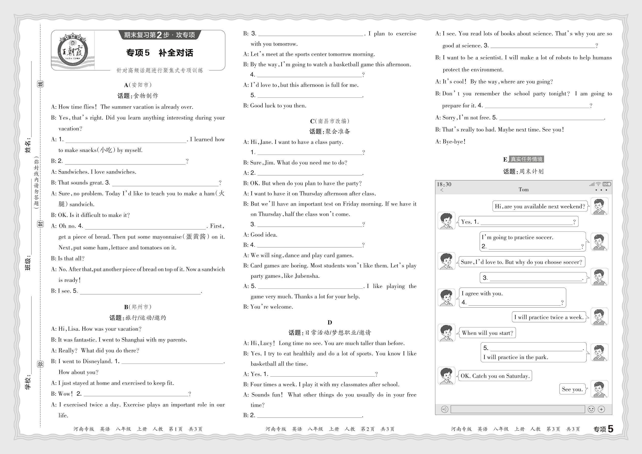 2023秋上册八年级英语人教版 期末专项卷·补全对话【5】
