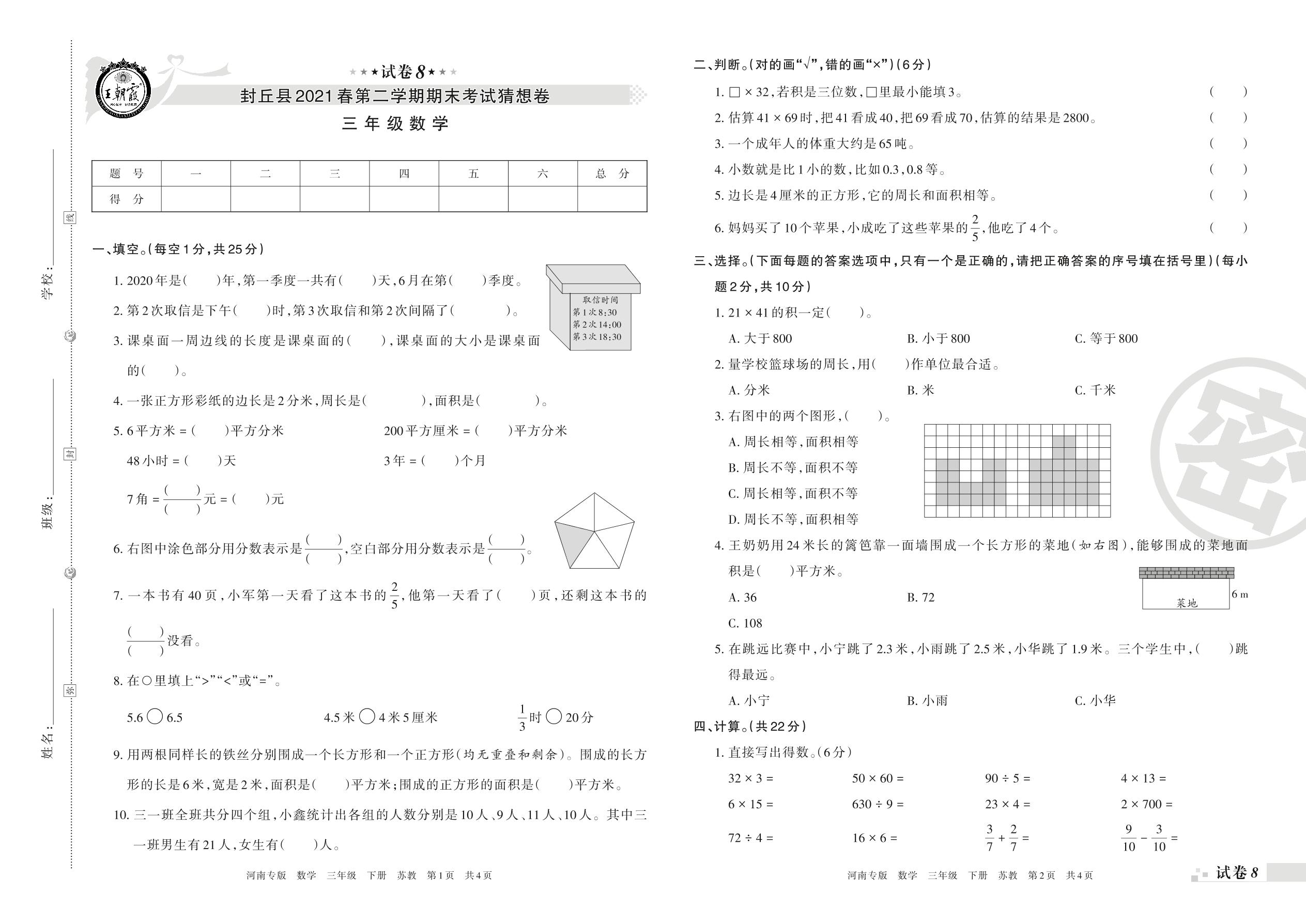2020-2021学年第二学期新乡市封丘县三年级数学试卷(苏教版)【8】