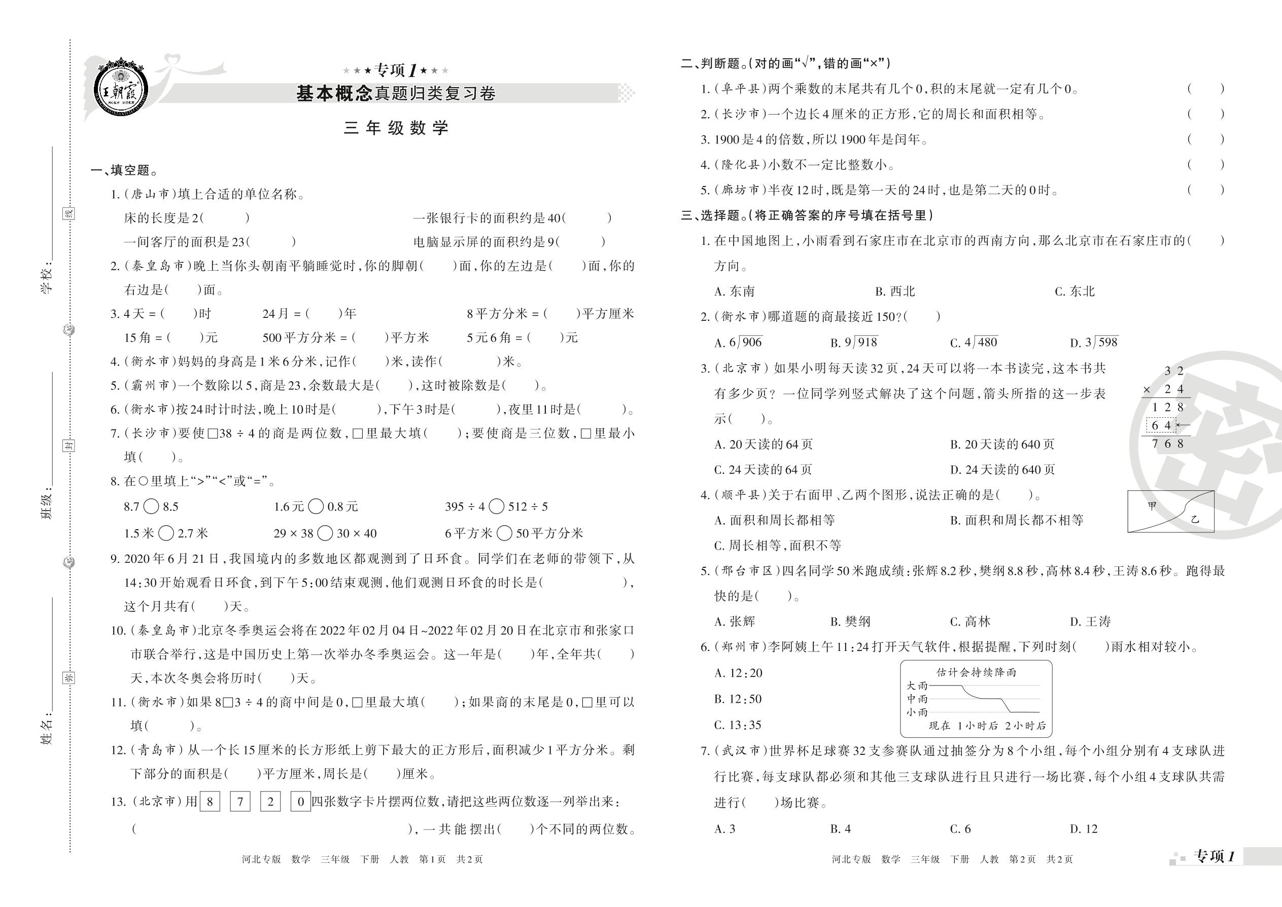 王朝霞期末专项卷——基本概念、计算真题归类复习三年级下册数学(人教版)_R21080485514【0】