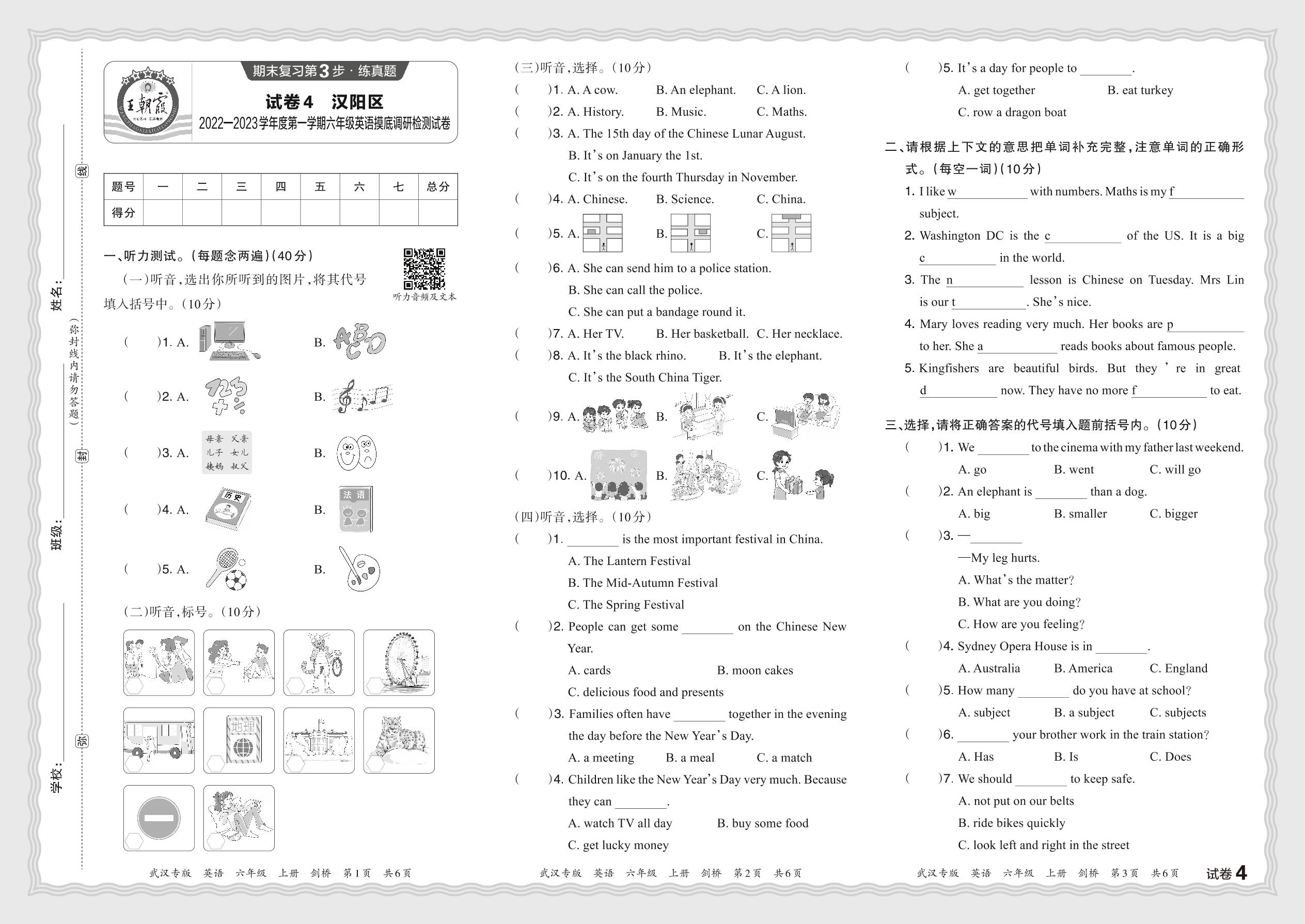 湖北省武汉市汉阳区2022—2023学年度第一学期六年级英语摸底调研检测试卷(剑桥版)【4】