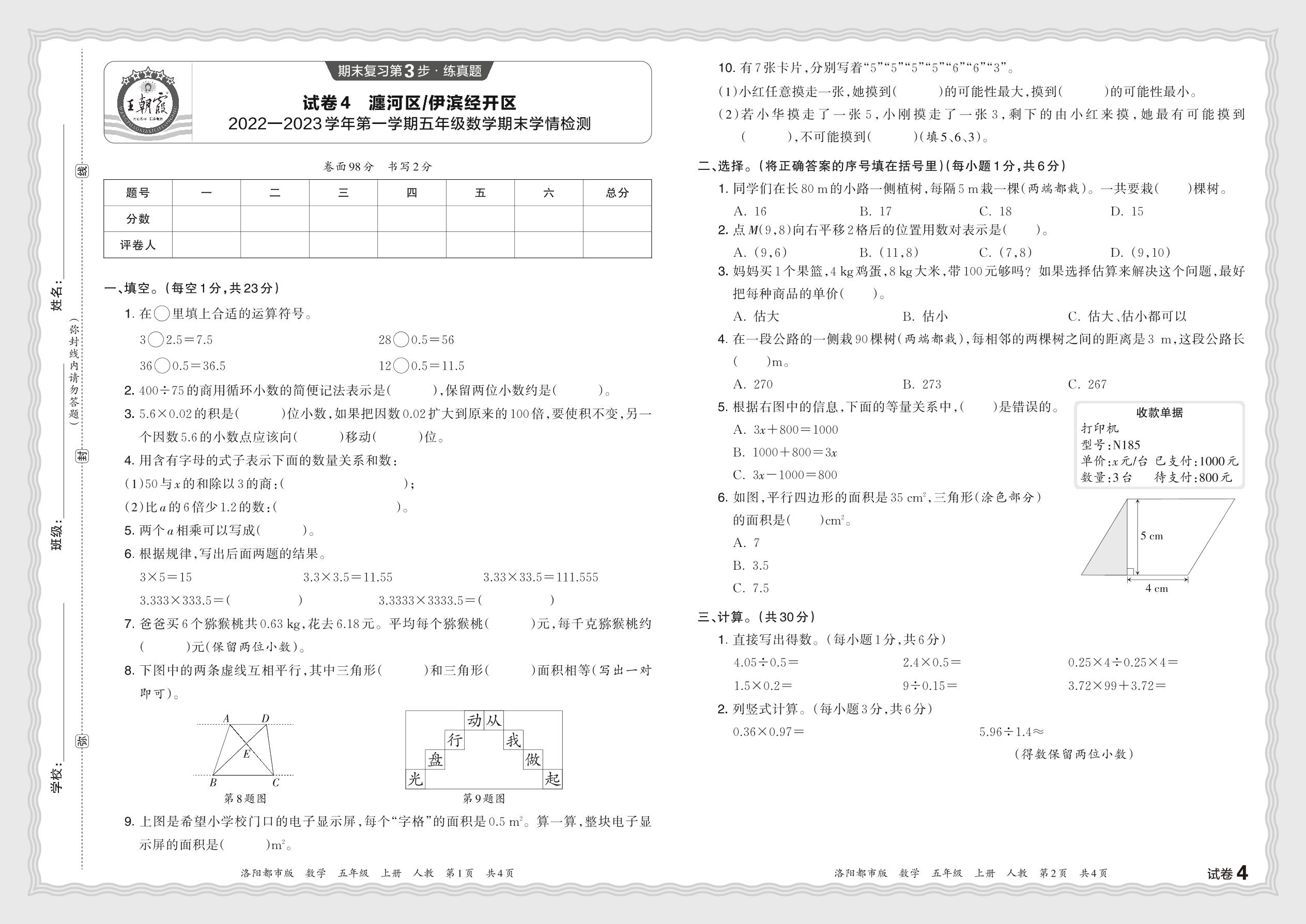 河南省洛阳市瀍河区、伊滨经开区2022—2023学年第一学期五年级数学期末学情检测(人教版)【4】