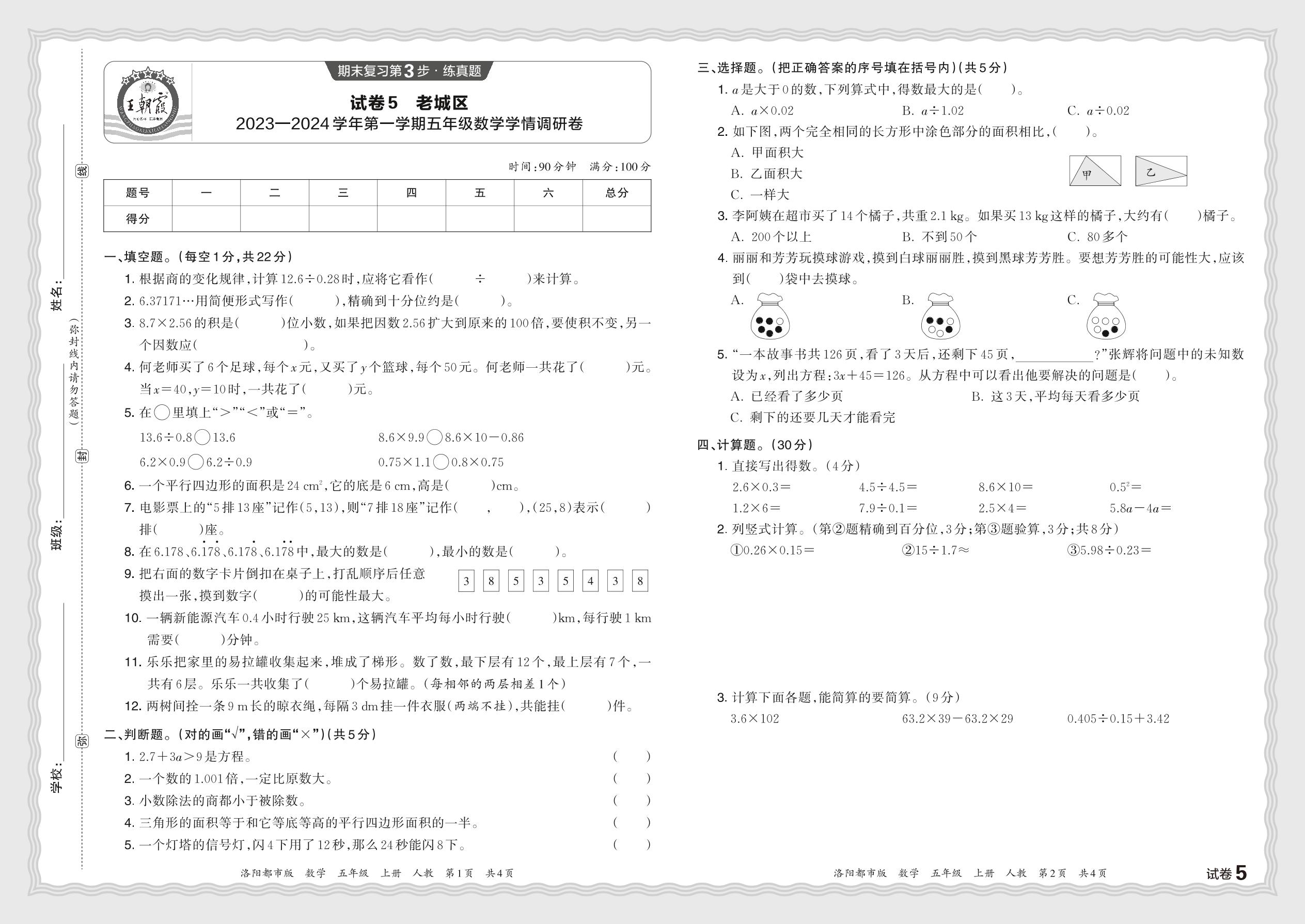 河南省洛阳市老城区2023—2024 学年第一学期五年级数学学情调研卷【5】