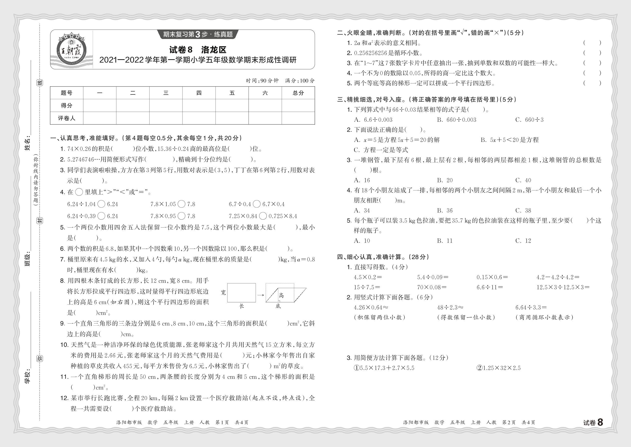 河南省洛阳市洛龙区2021—2022学年第一学期小学五年级数学期末形成性调研(人教版)【8】