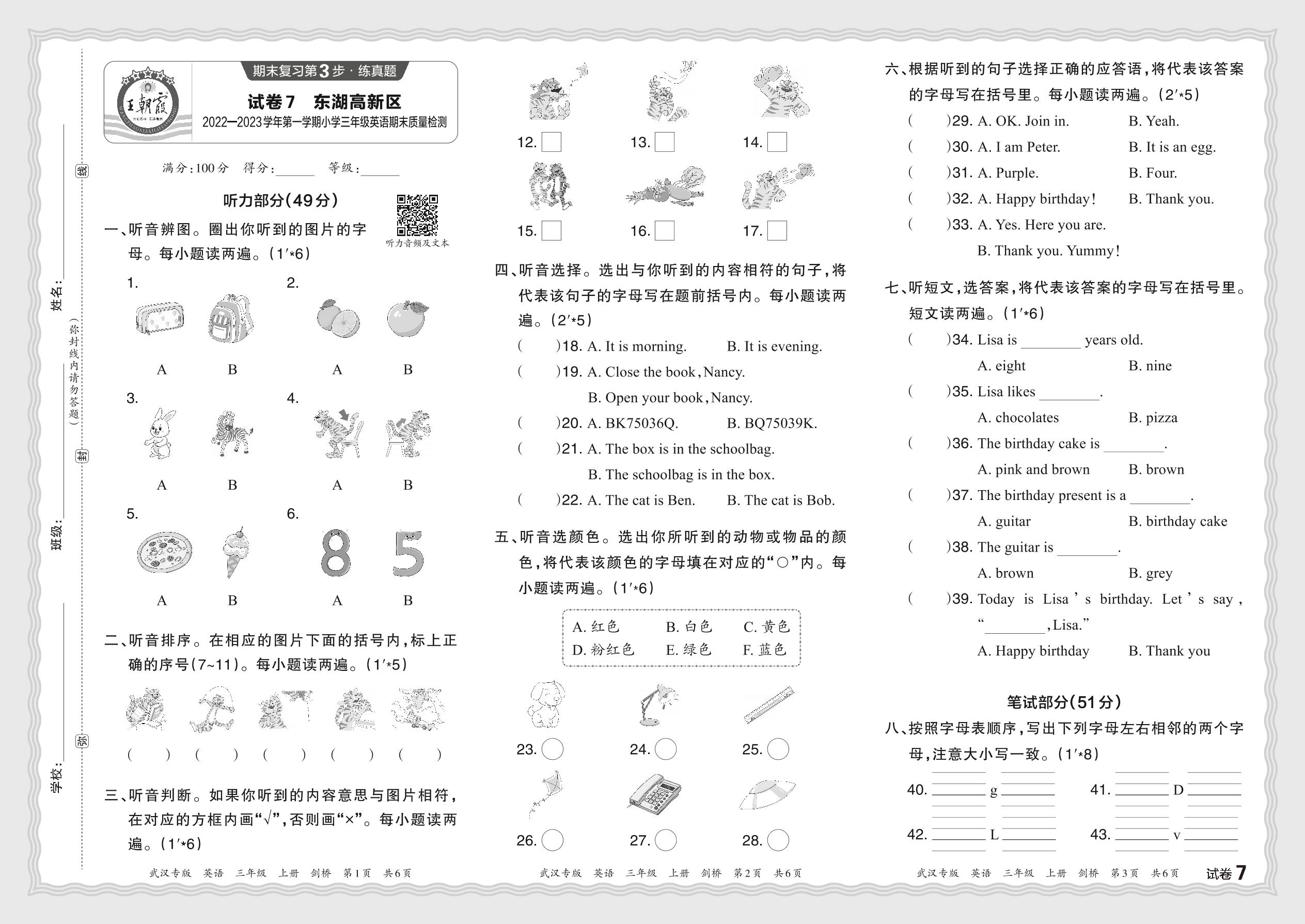 湖北省武汉市东湖高新区2022—2023学年第一学期小学三年级英语期末质量检测(剑桥版)【7】