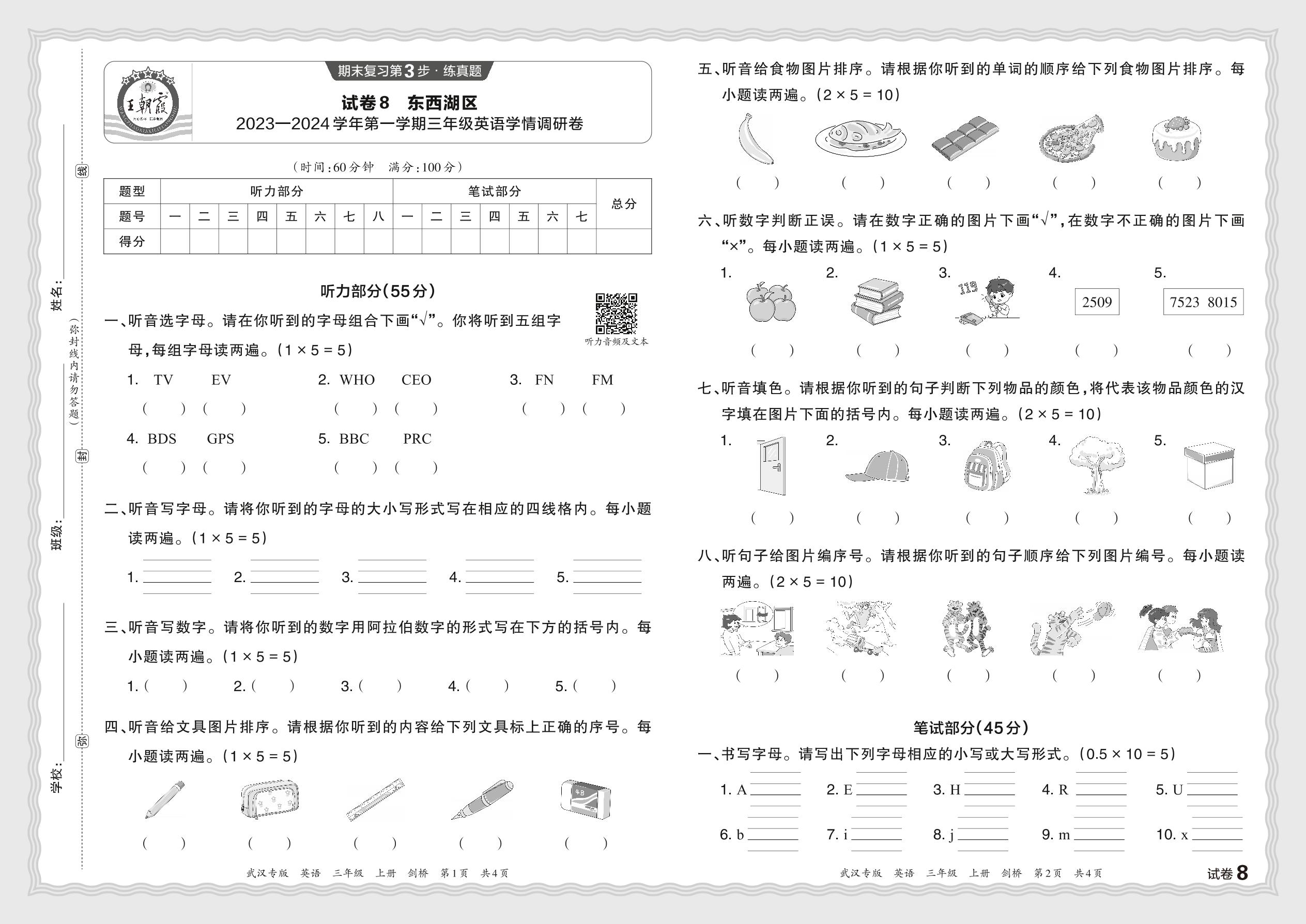 湖北省武汉市东西湖区2023—2024学年第一学期三年级英语学情调研卷(剑桥版)【8】