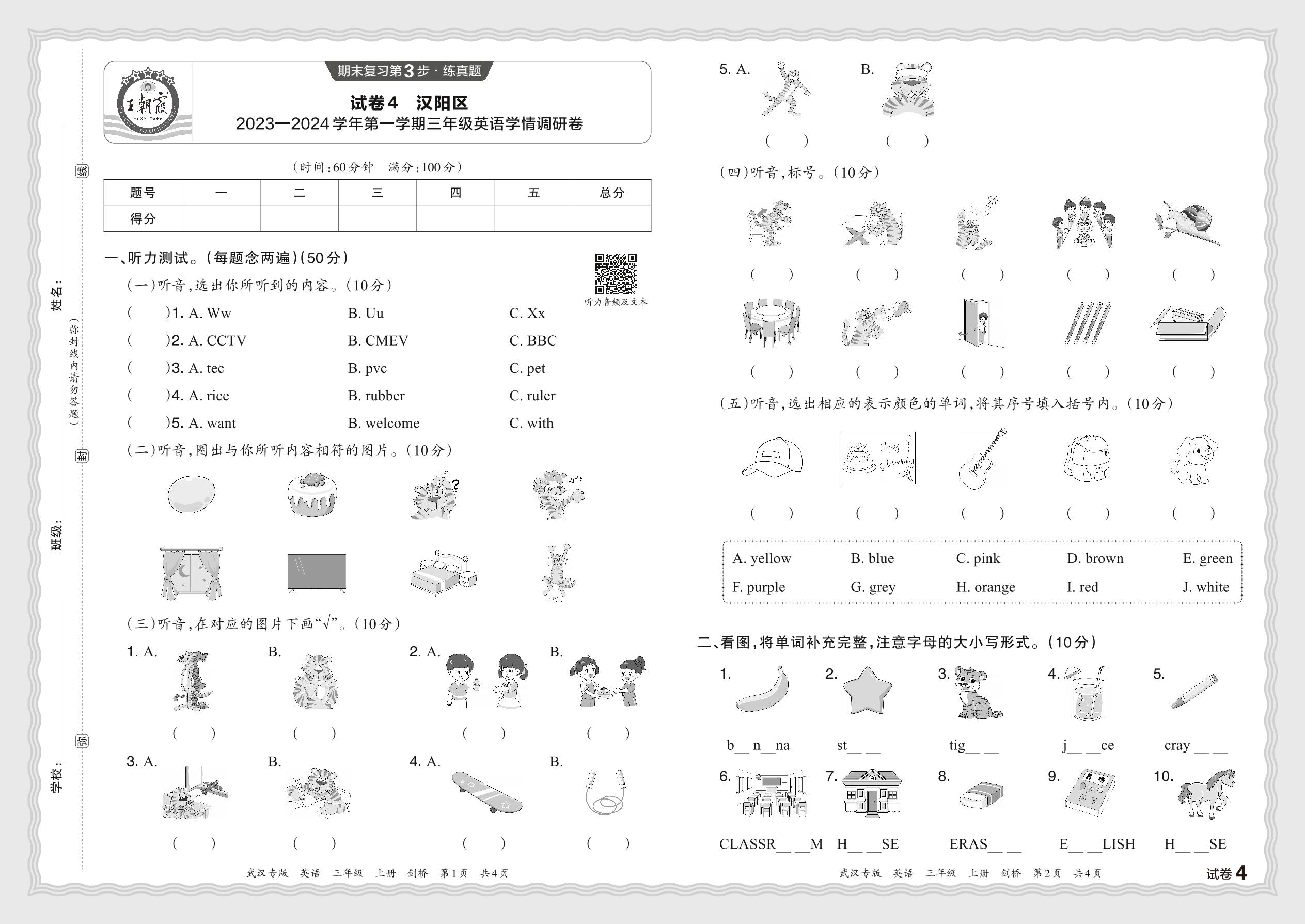 湖北省武汉市汉阳区2023—2024学年第一学期三年级英语学情调研卷(剑桥版)【4】