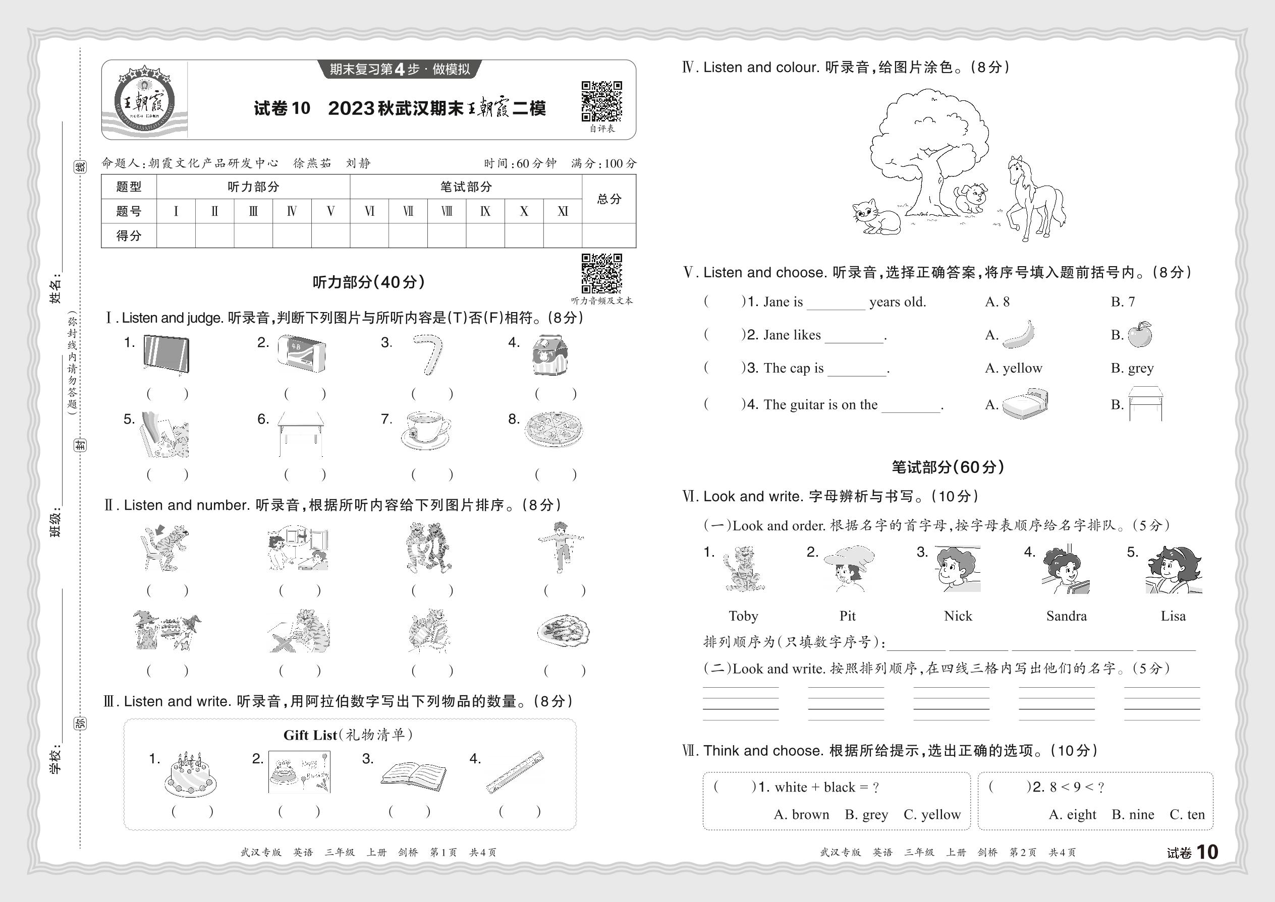 2023秋上册三年级英语剑桥版 湖北武汉期末王朝霞二模