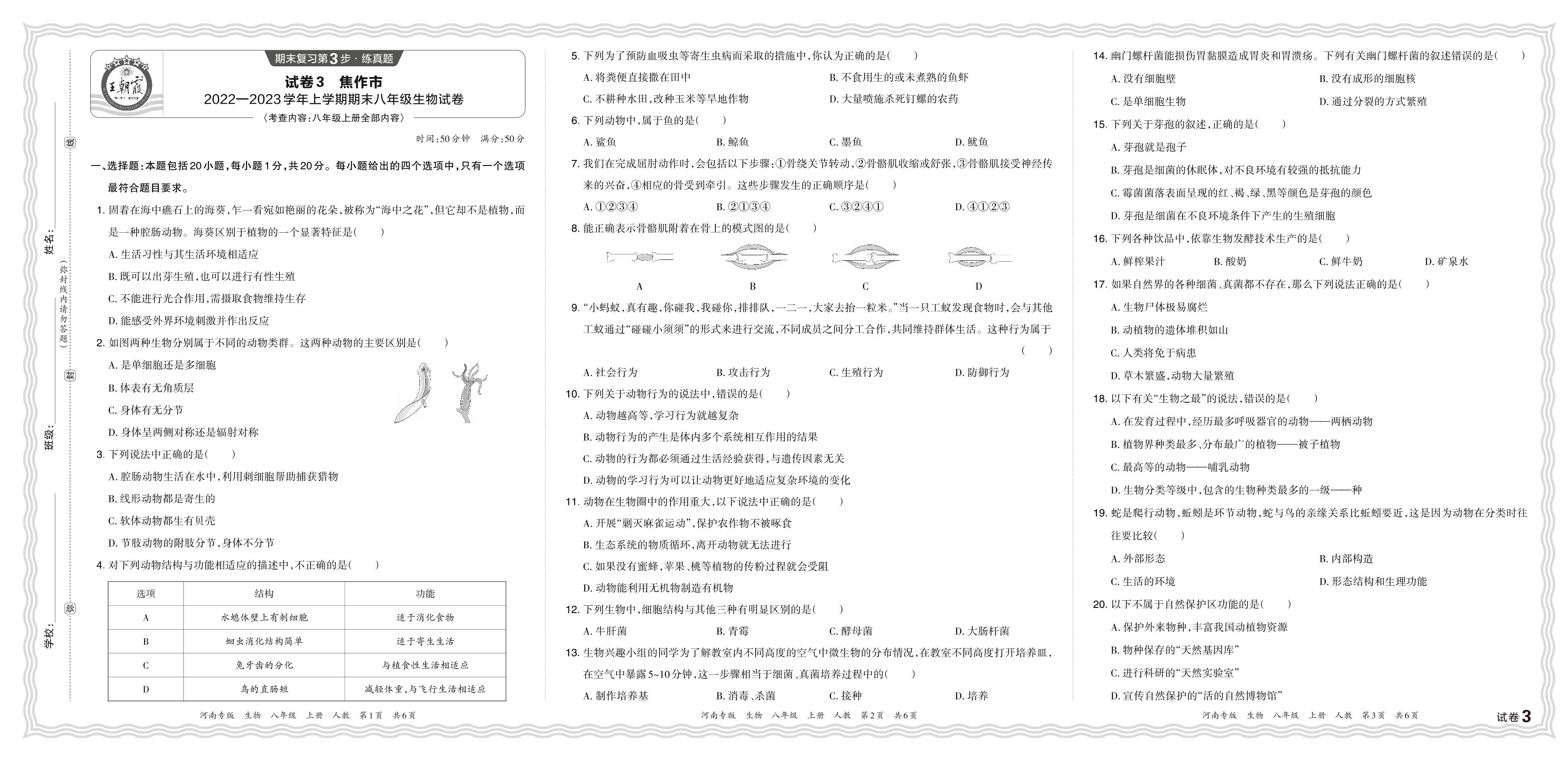 河南省焦作市2022—2023学年上学期期末八年级生物试卷(人教版)【3】