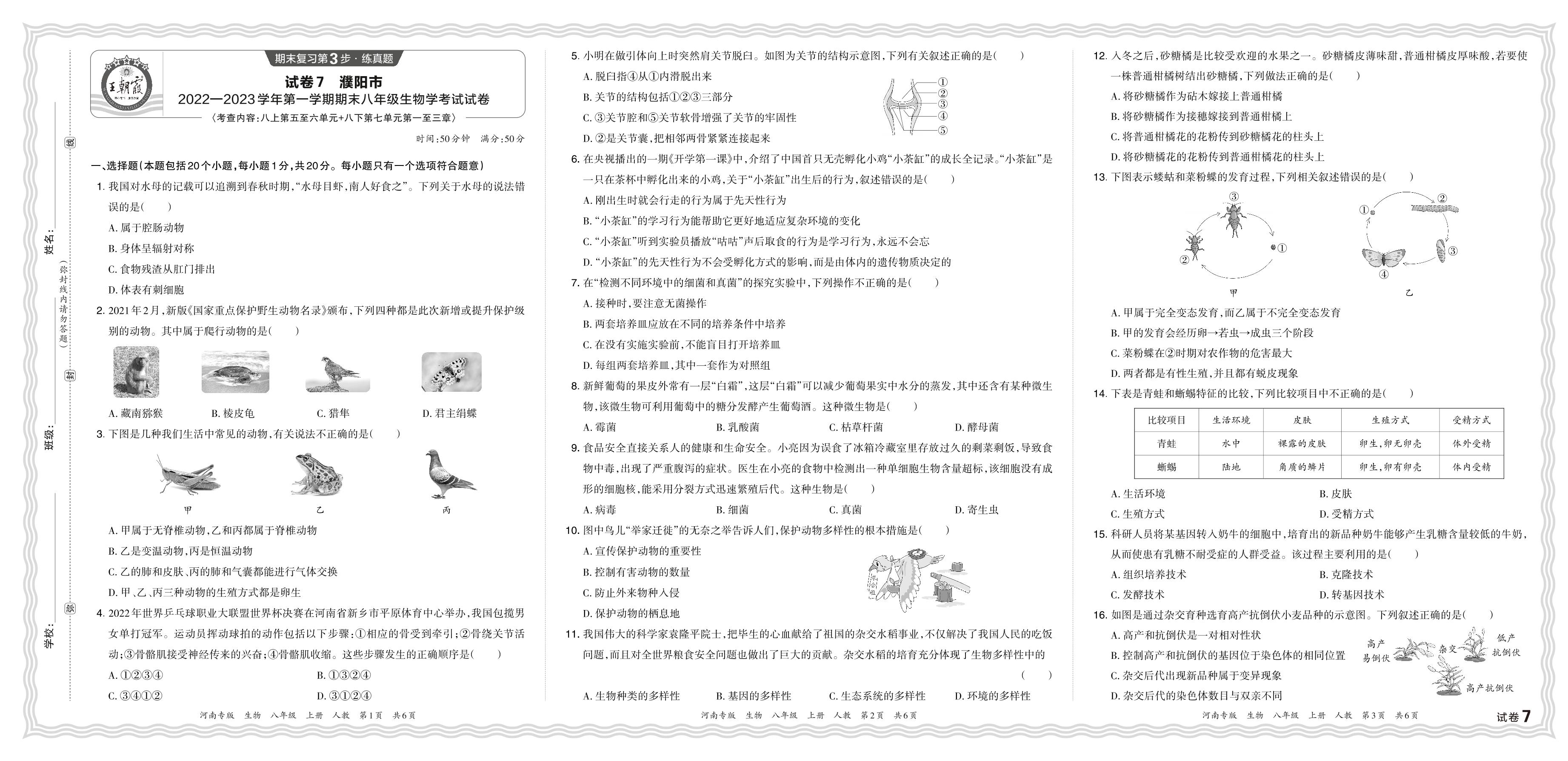 河南省濮阳市2022—2023学年第一学期期末八年级生物学考试试卷(人教版)【7】