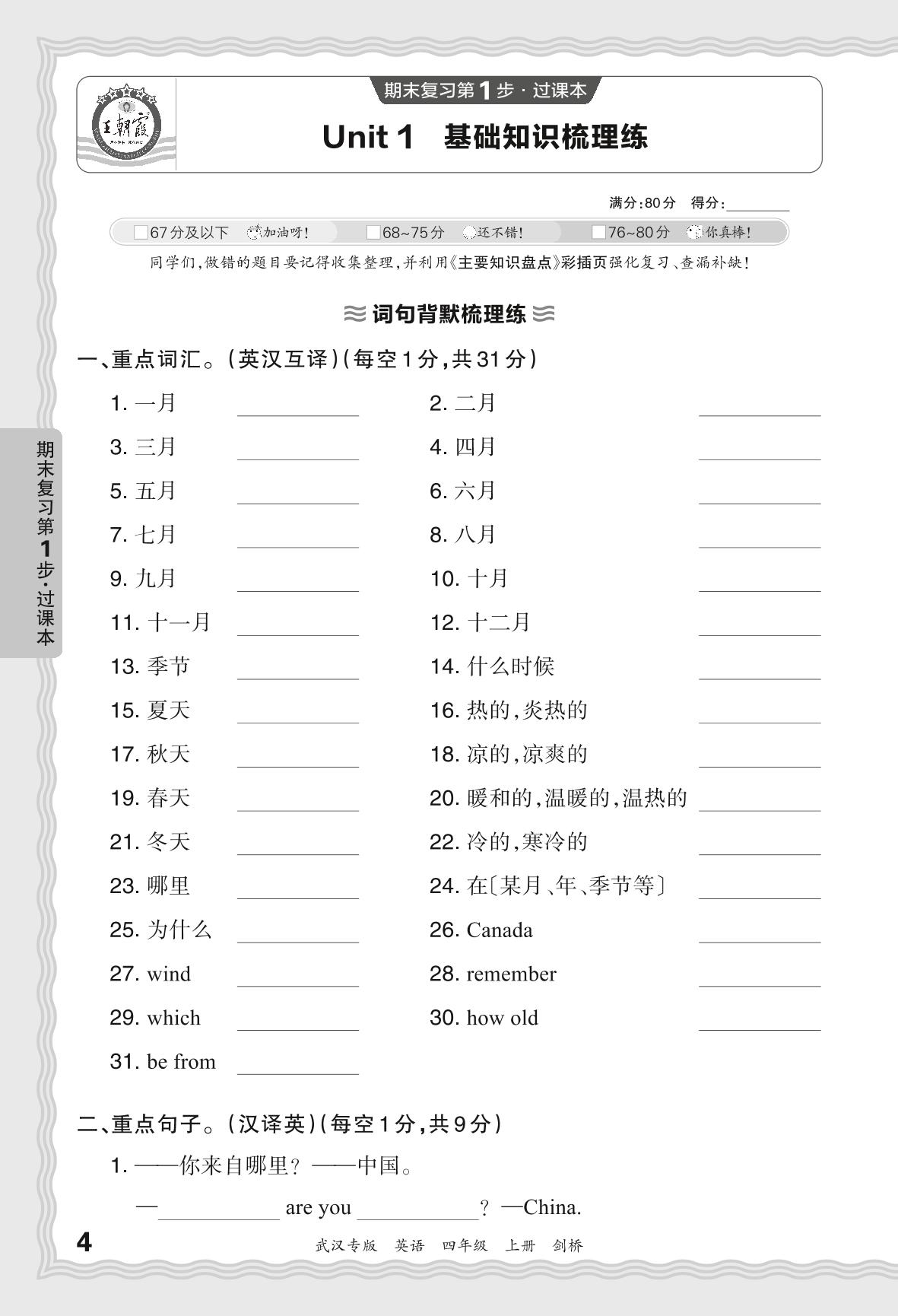 2023秋上册四年级英语剑桥版 期末过课本·Unit 1 基础知识梳理练