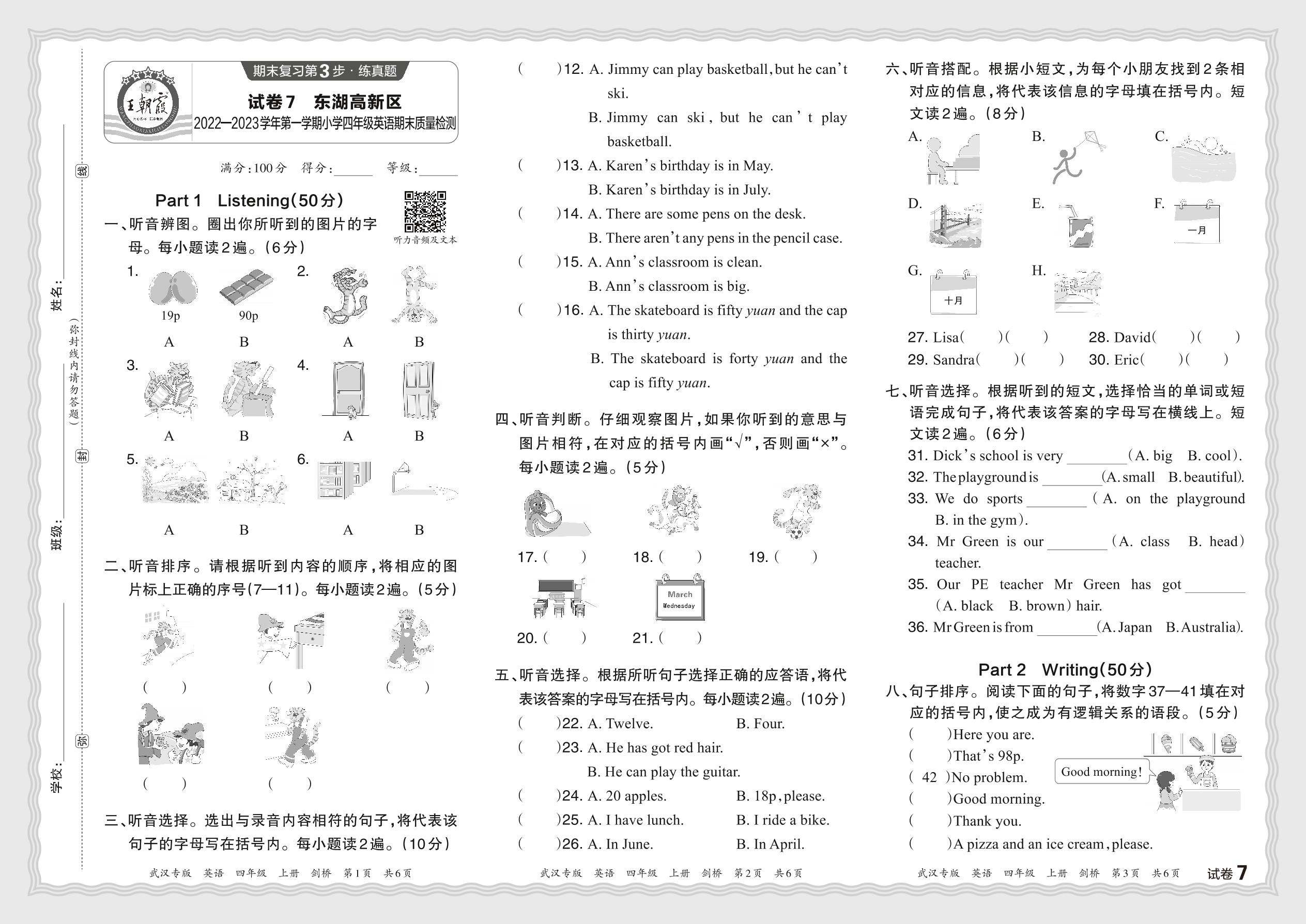 湖北省武汉市东湖高新区2022—2023学年第一学期小学四年级英语期末质量检测剑桥版【7】