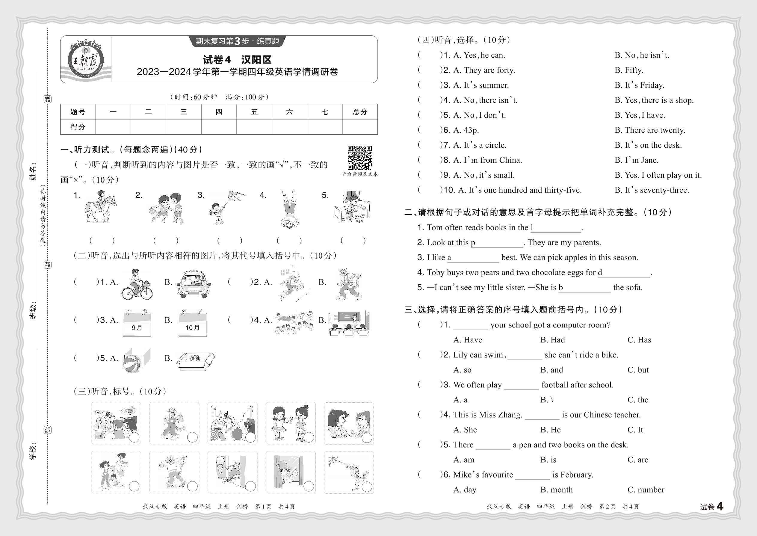 湖北省武汉市汉阳区2023—2024学年第一学期四年级英语学情调研卷剑桥版【4】
