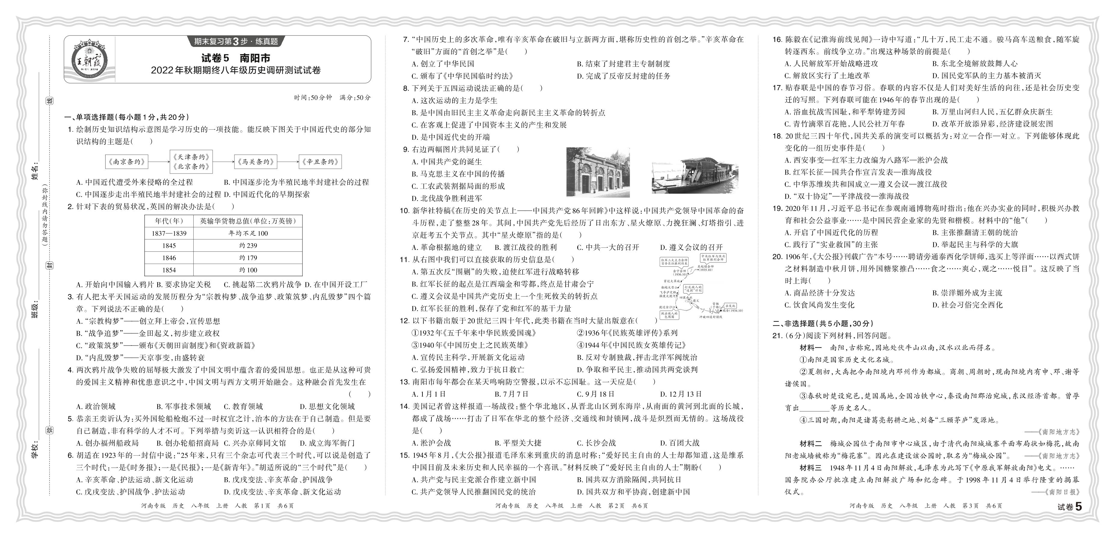 河南省南阳市2022年秋期期终八年级历史调研测试试卷(人教版)【5】