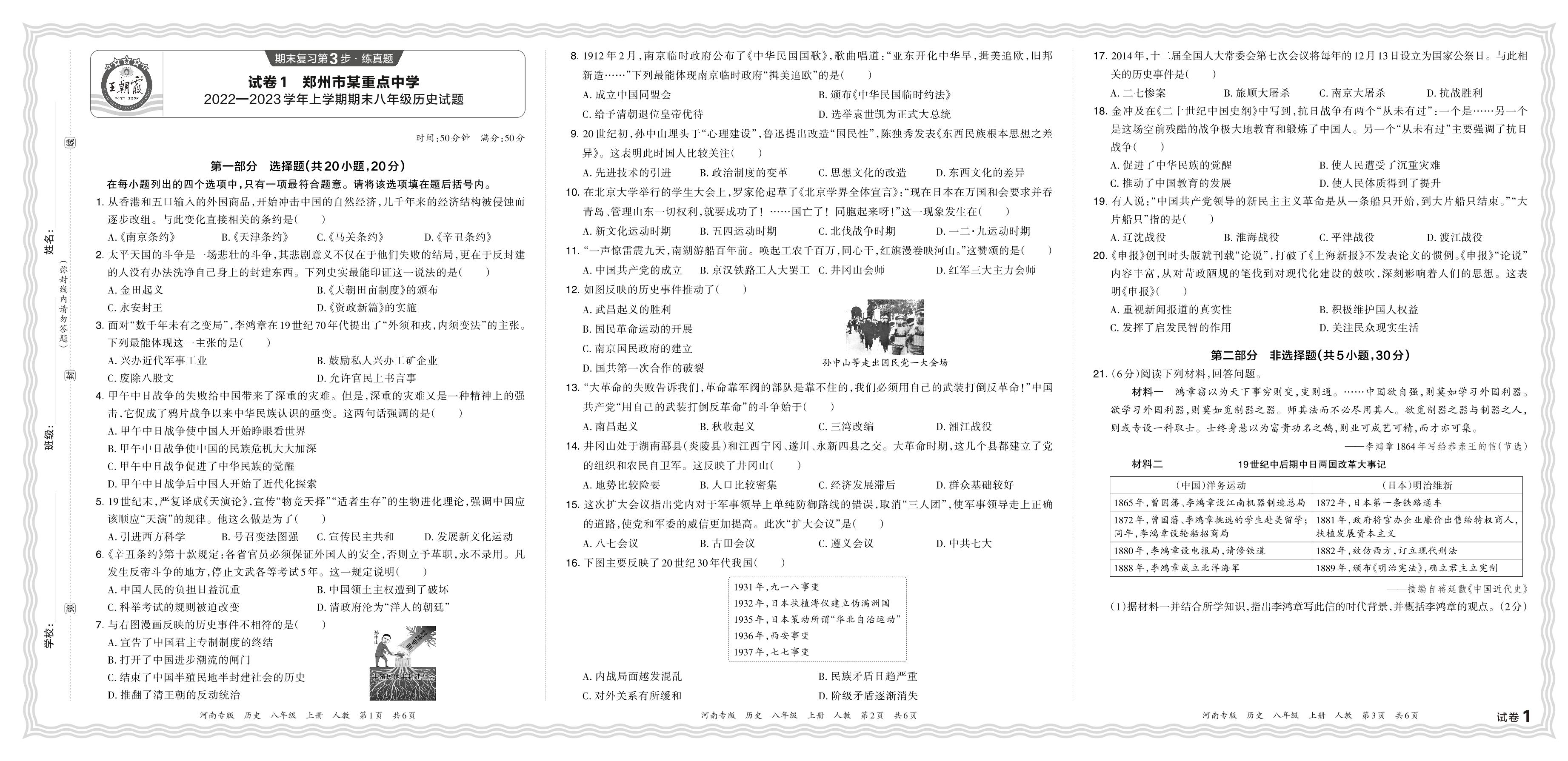河南省郑州市某重点中学2022—2023学年上学期期末八年级历史试题(人教版)【1】