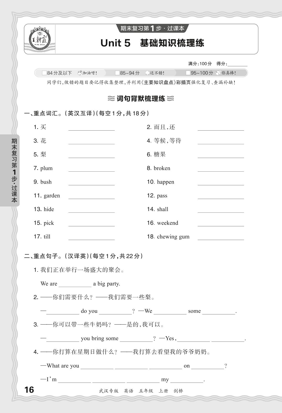 2023秋上册五年级英语剑桥版 期末过课本·Unit 5 基础知识梳理练