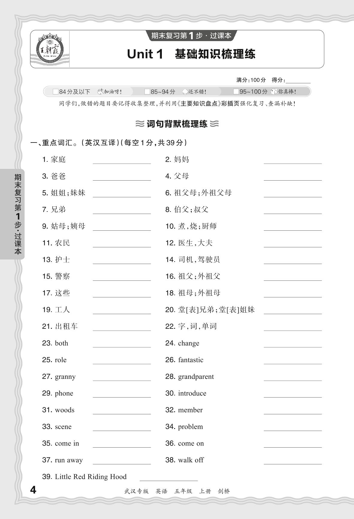 2023秋上册五年级英语剑桥版 期末过课本·Unit 1 基础知识梳理练